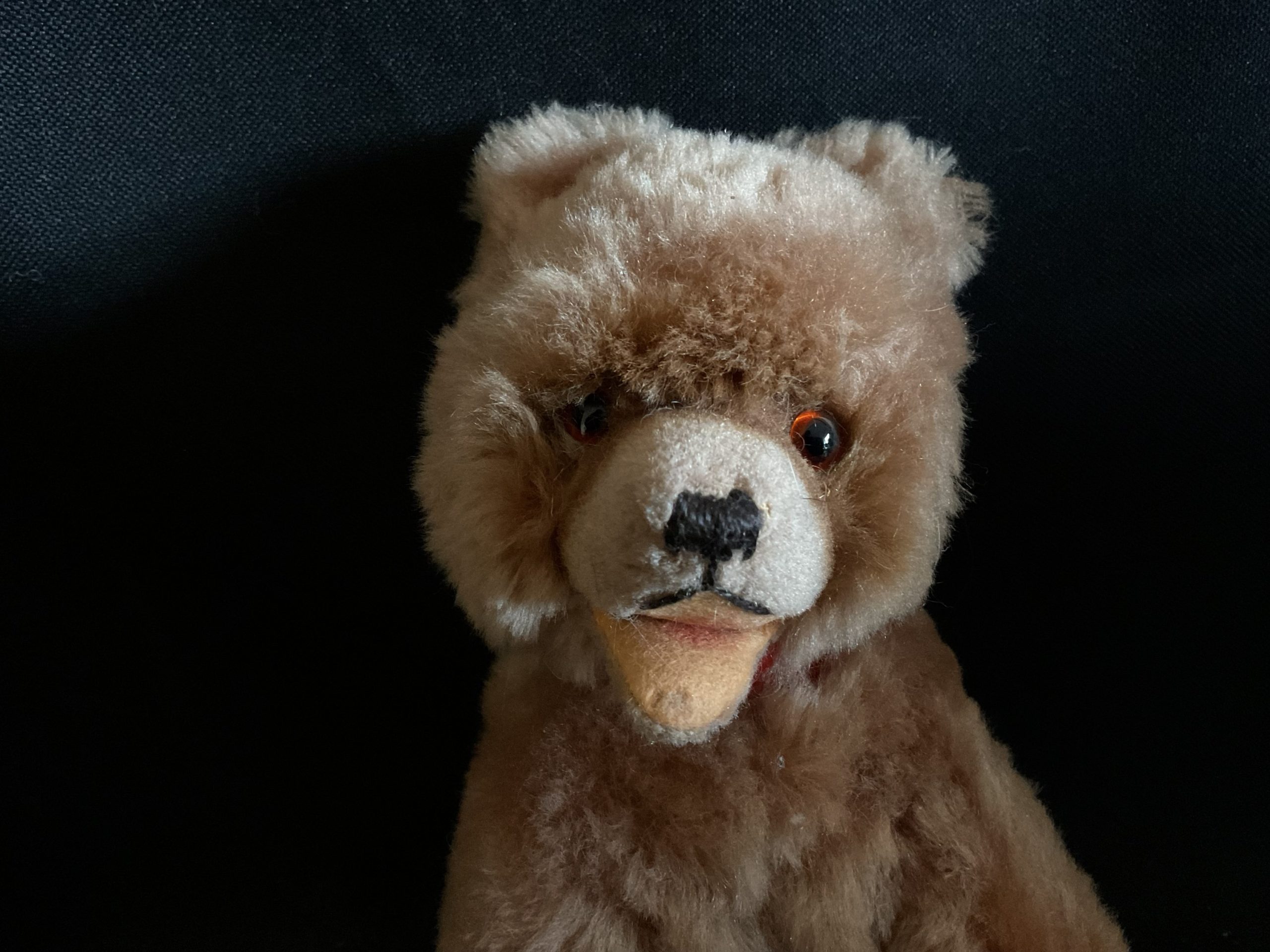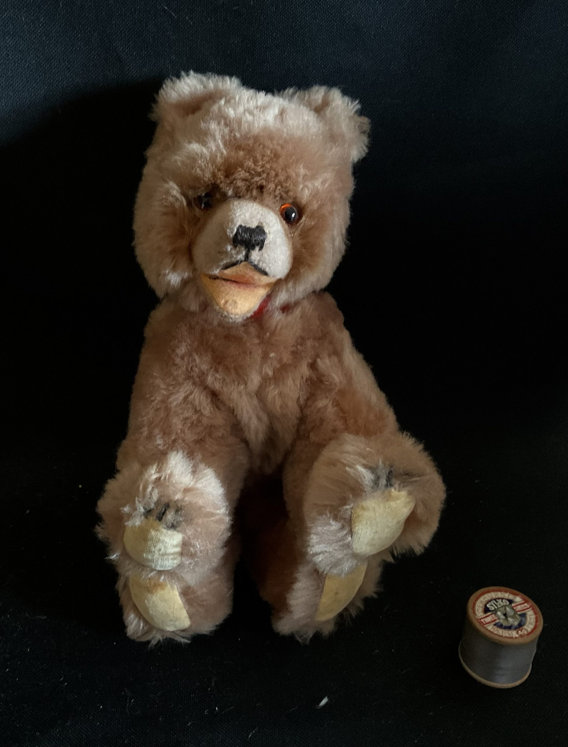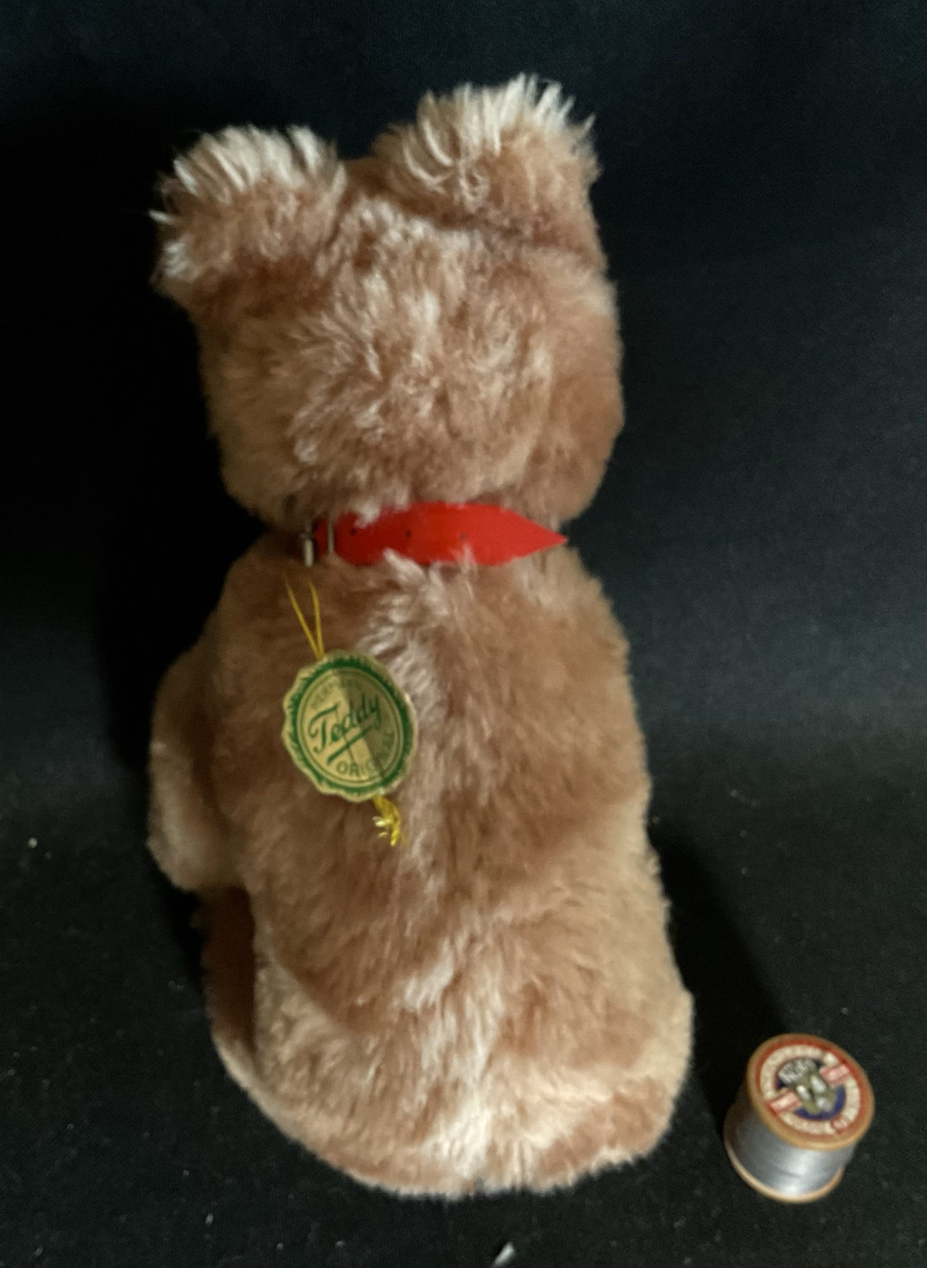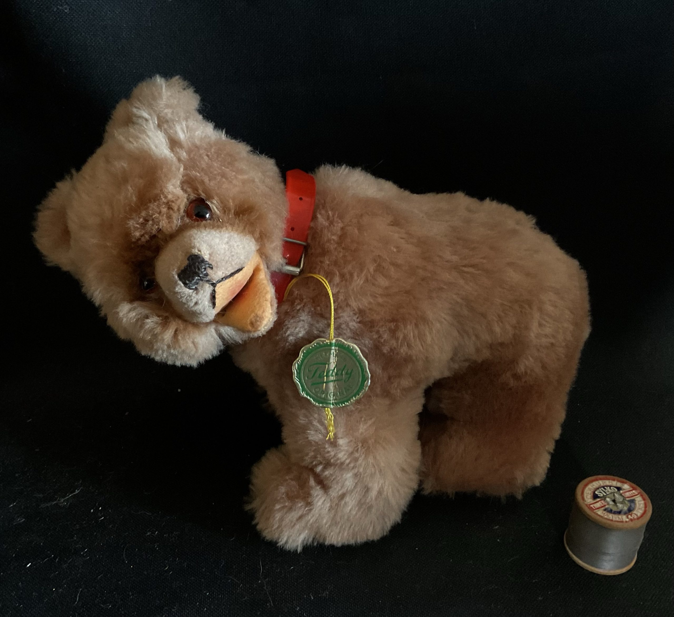 Boo-Boo Vintage bear cub on all fours made by Hermann teddies Germany. Wood wool filled with wire, dense plush with glass eyes and felt features and collar, Original swing tag in place. Cleaned and checked over. Stands at aprox 20cm