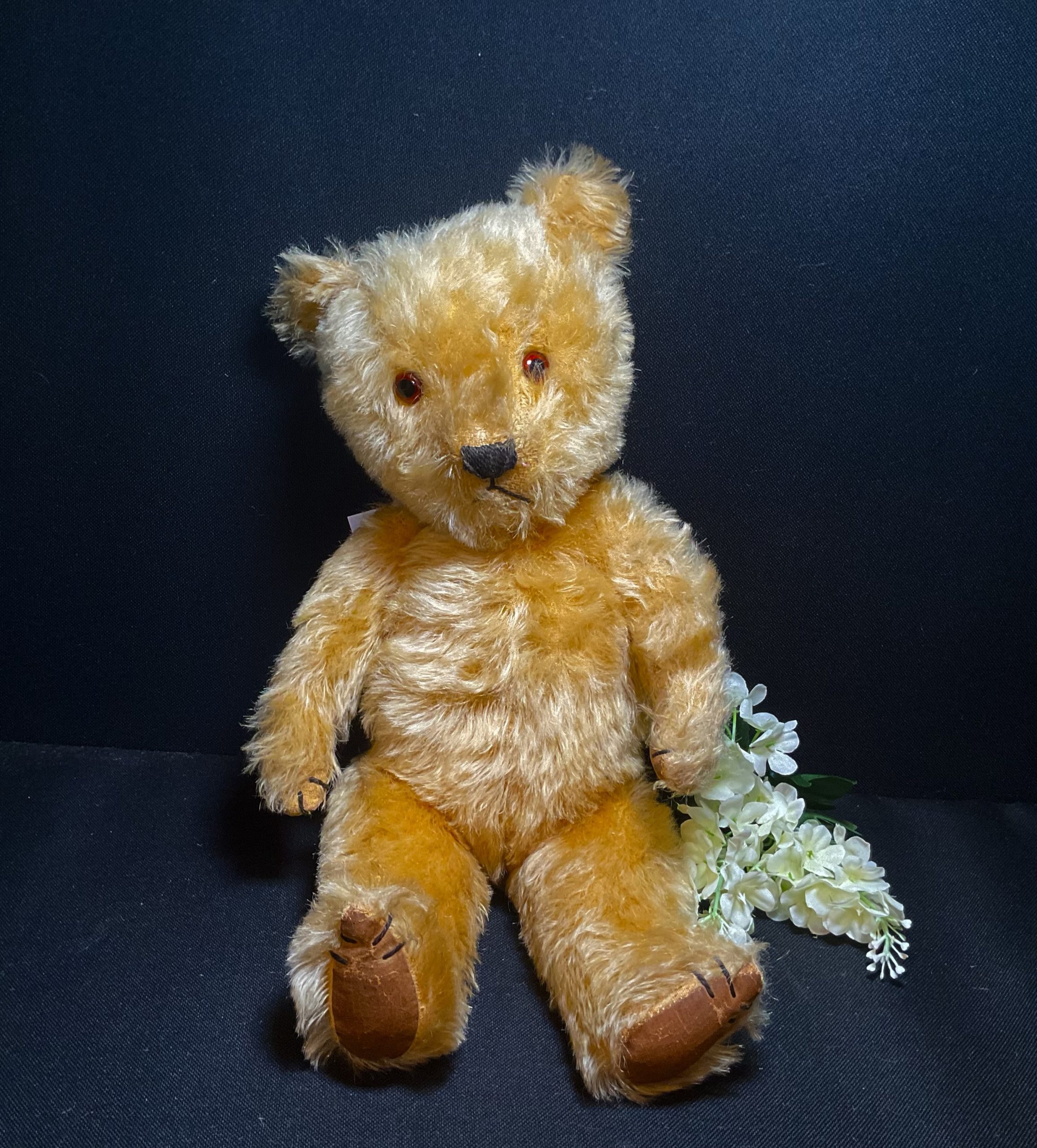 Crispin is a wonderful English made Chiltern Hugmee style bear from the 1930/40’s. He is approximately 43cm tall. He is fully jointed with glass eyes. He is a lovely collectors piece or a family heirloom He has had no need for any restoration work only a good clean, minimal moth damage