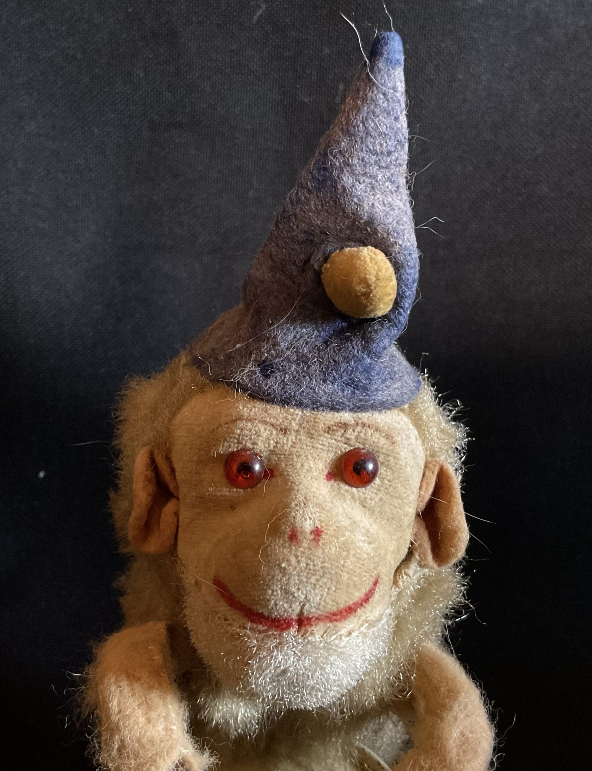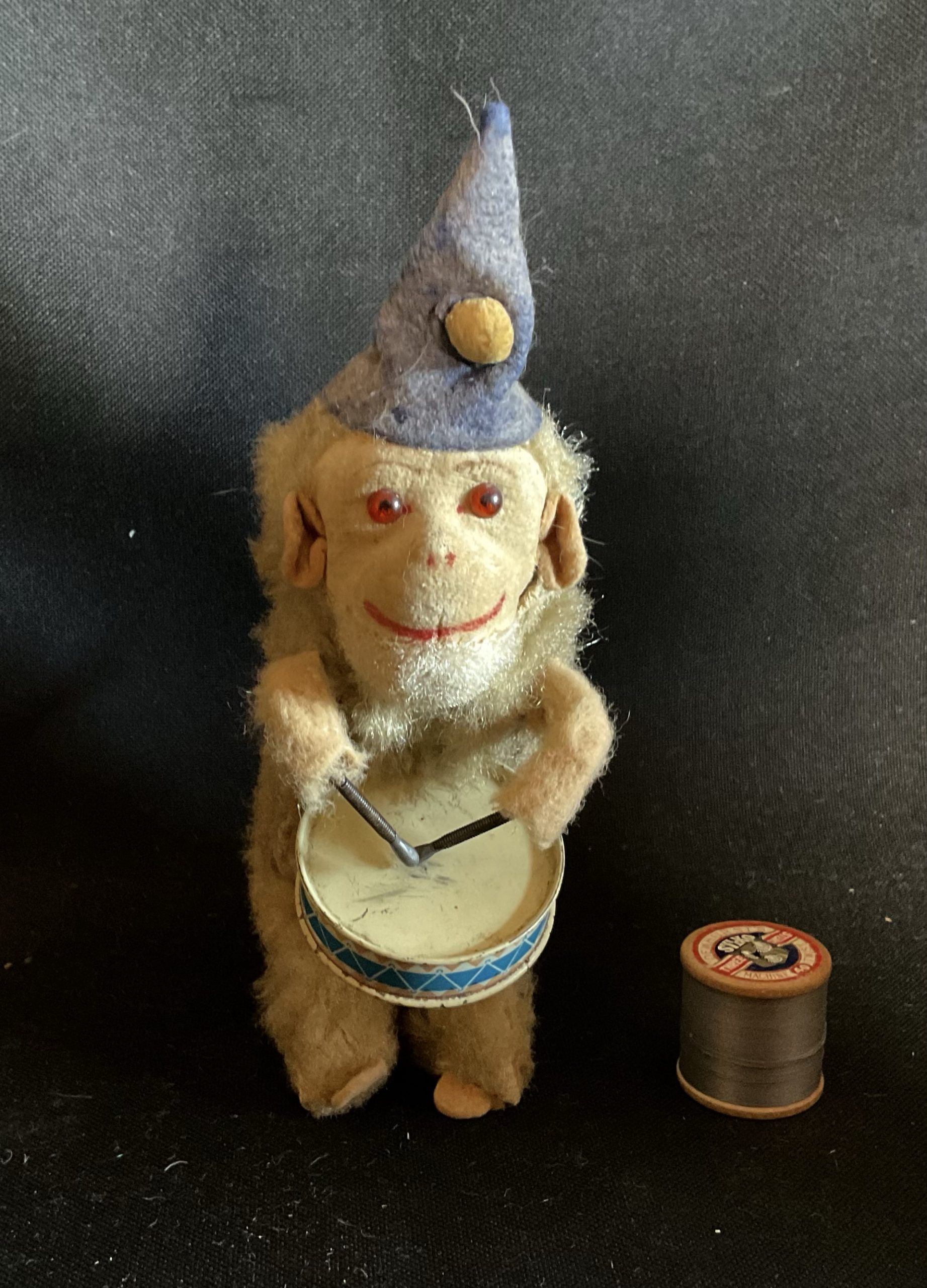 Drummer A Max Carl German monkey drummer from 1940/50s. Classic wind up toy that is still working with care. Blue felt hat and amber eyes in a felt face. Stands at aprox