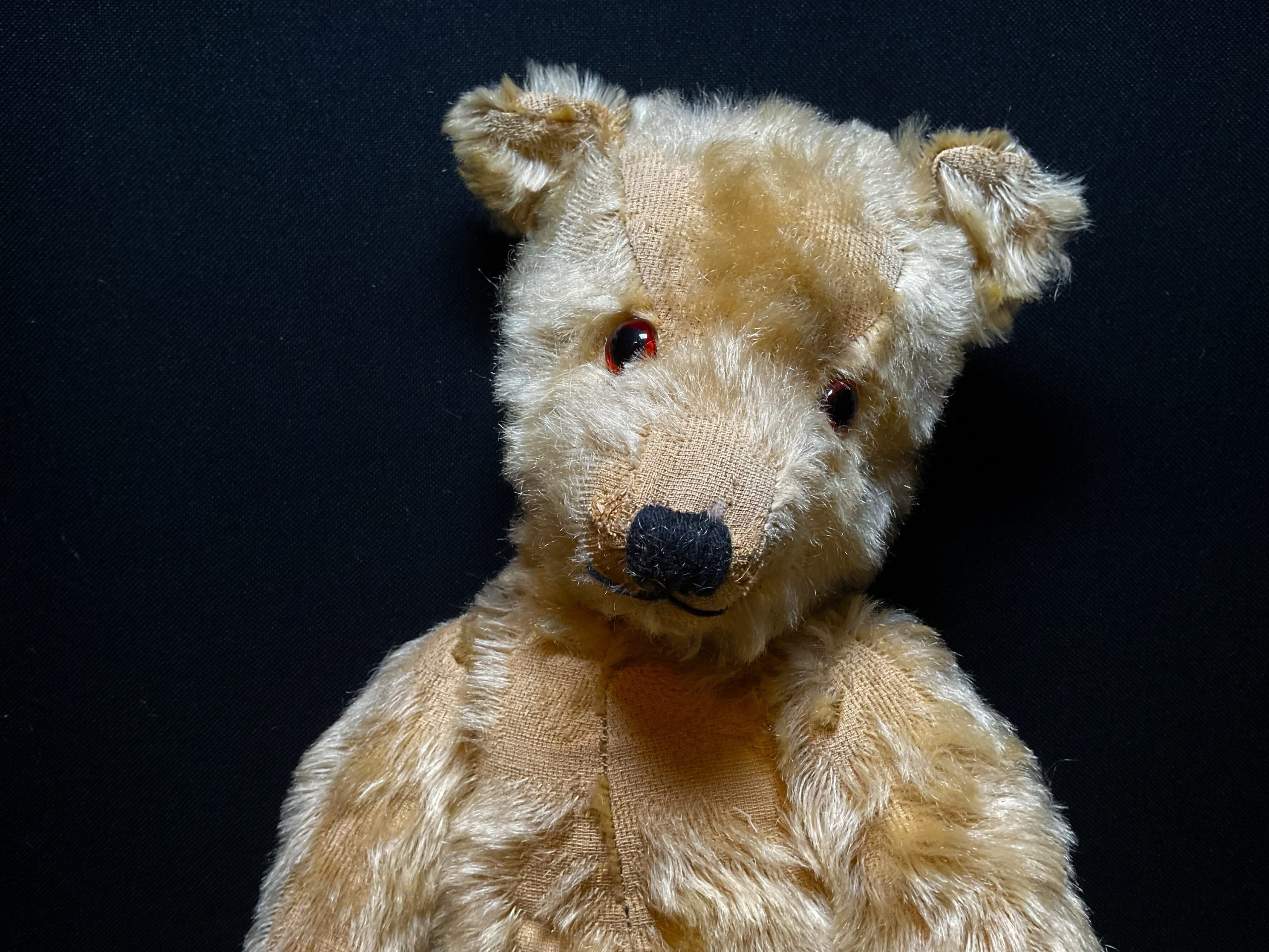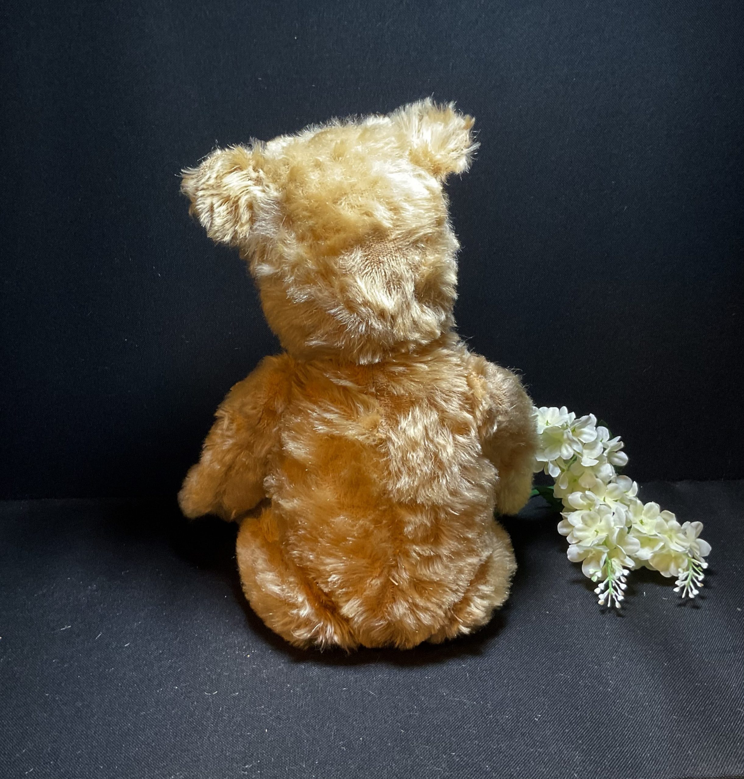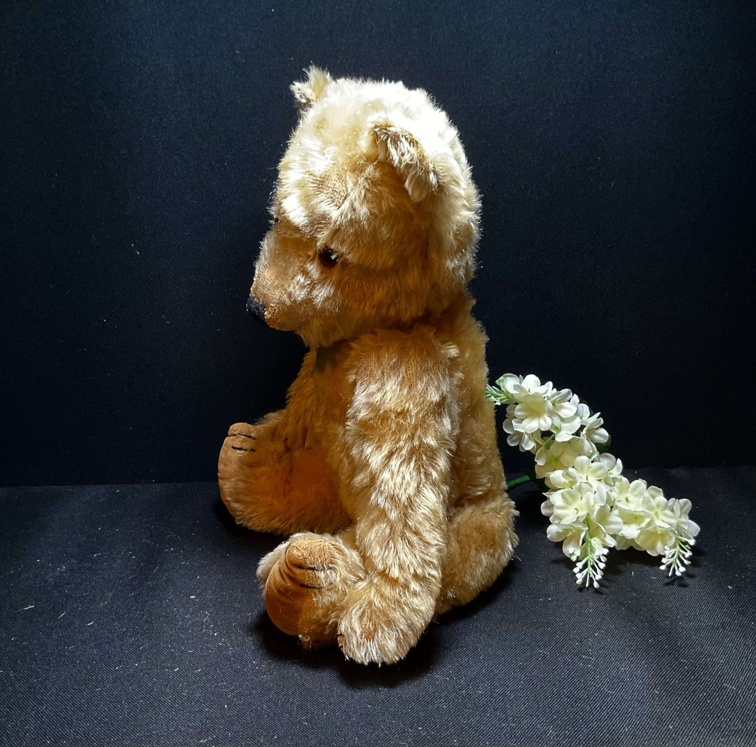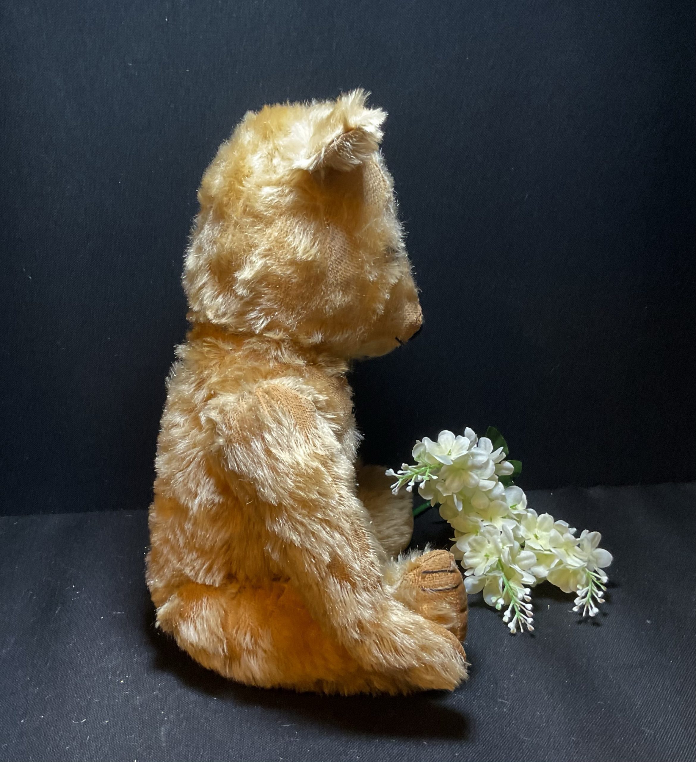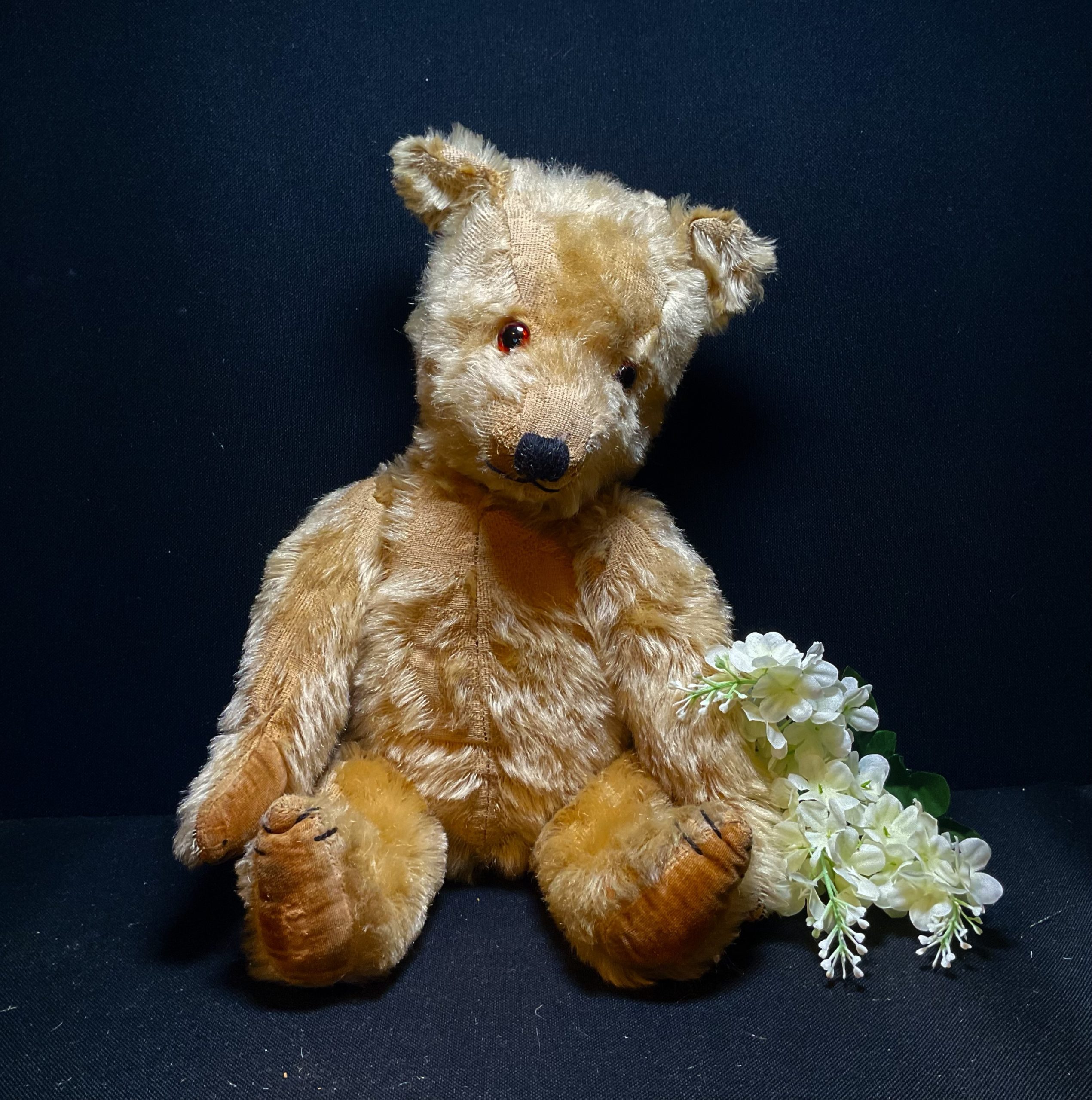 Gerald Chiltern Hugmee dating from 1930/40s. Classic English bear with blonde mohair, original glass eyes and soft velvet original pads , fully joined. Moth treated cleaned and checked over. He’s tired and ready for a relaxing comfort retirement home please? Standing at approximately 42cm