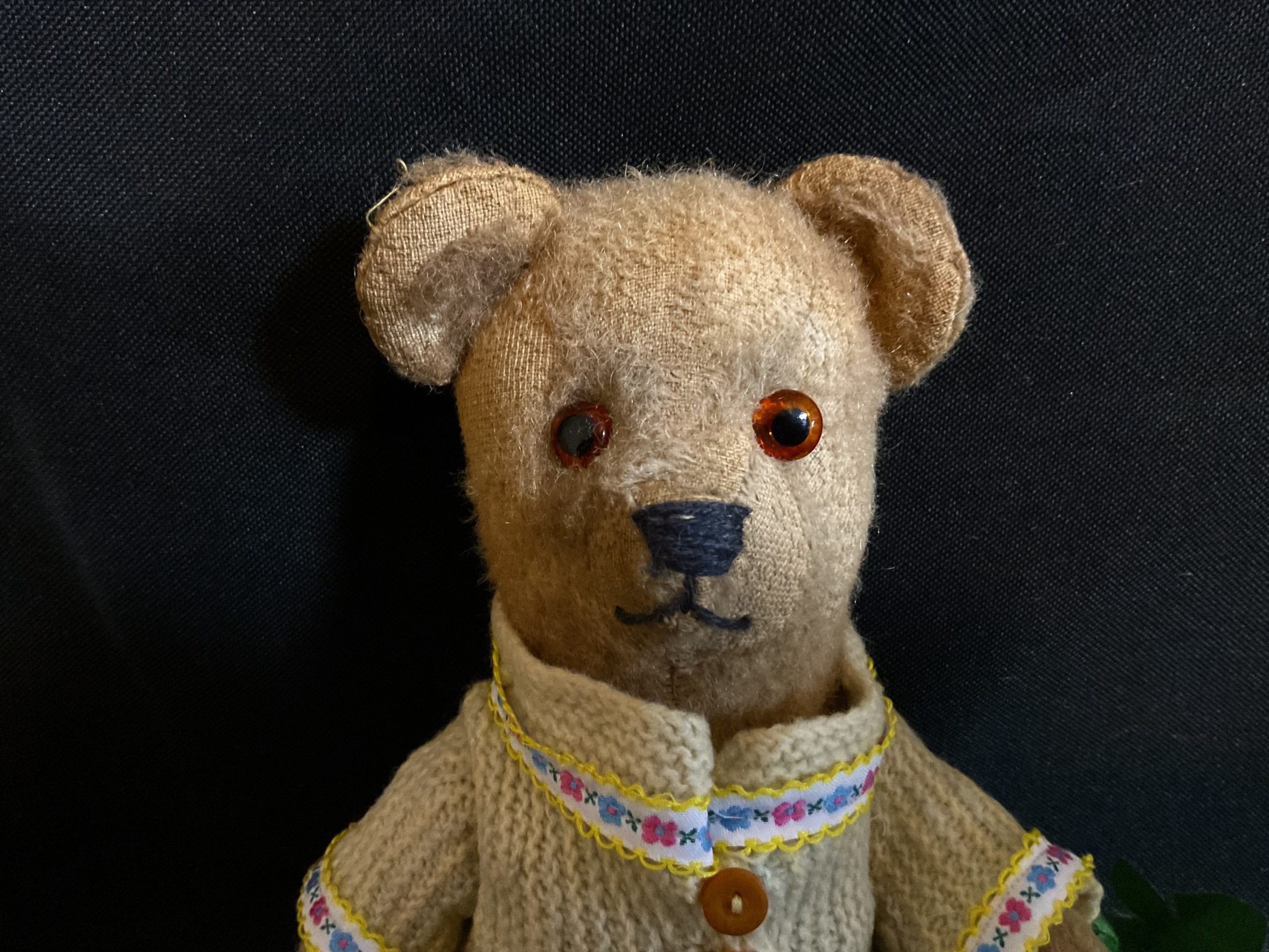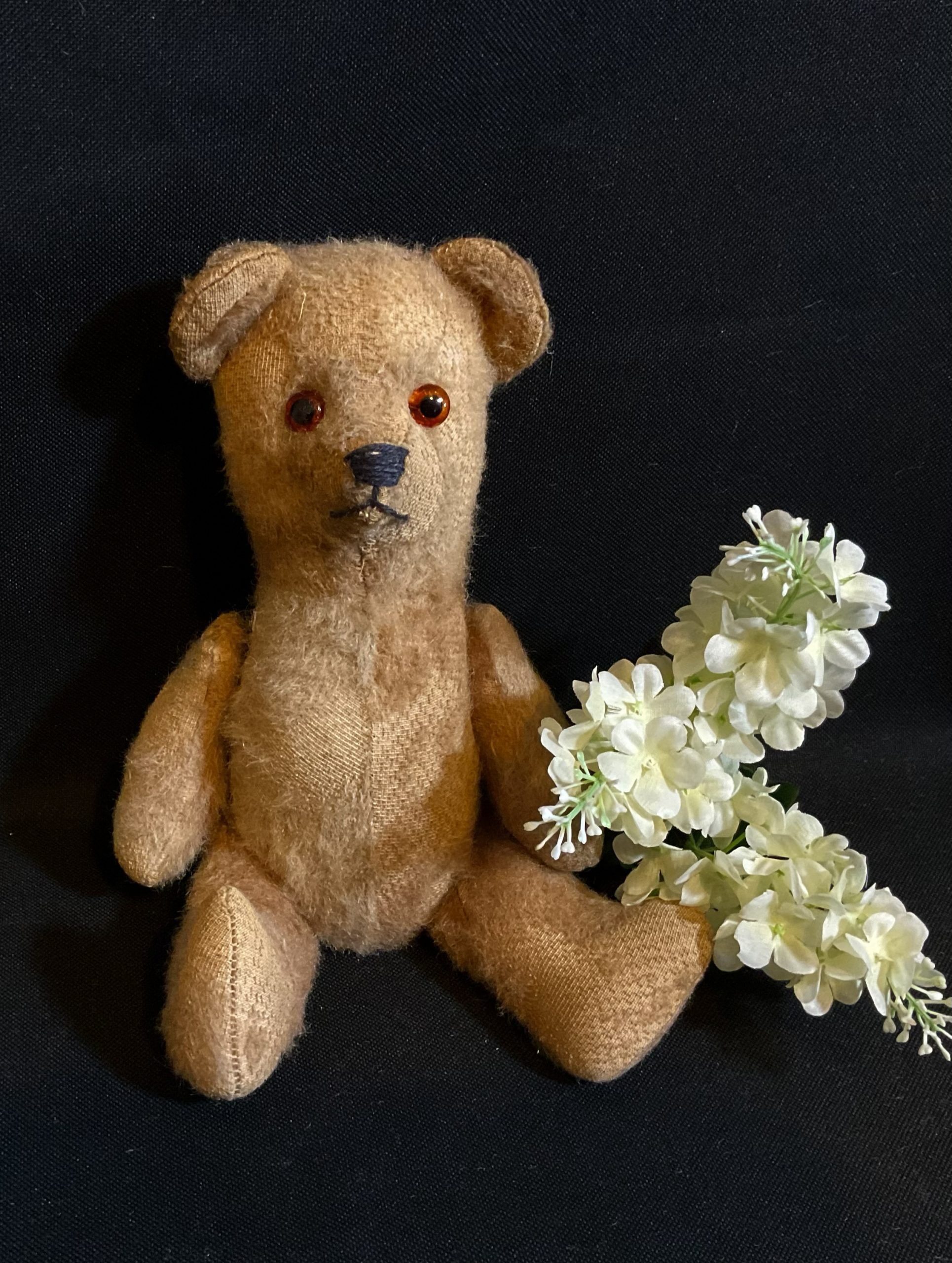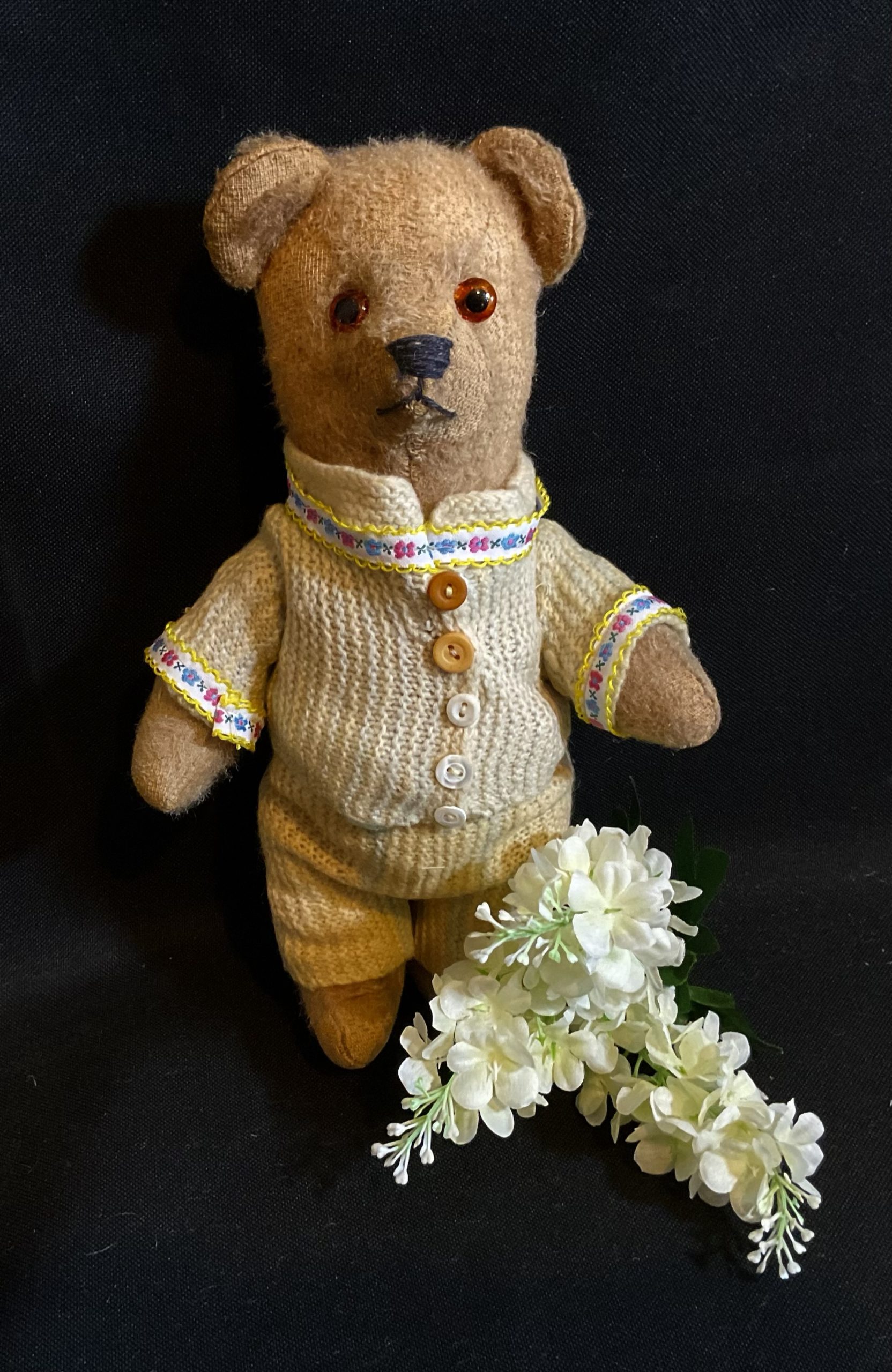 Penelope Came to me worn and in holey dirty clothes from an estate sale. Possibly handmade during or just after the war looking at her style and filling etc. Glass eyes, cord jointed small bear. Wearing original old hand kitted clothes that I’ve cleaned and smartened up. She’s now ready for her next chapter. Aprox 31cm high 12in
