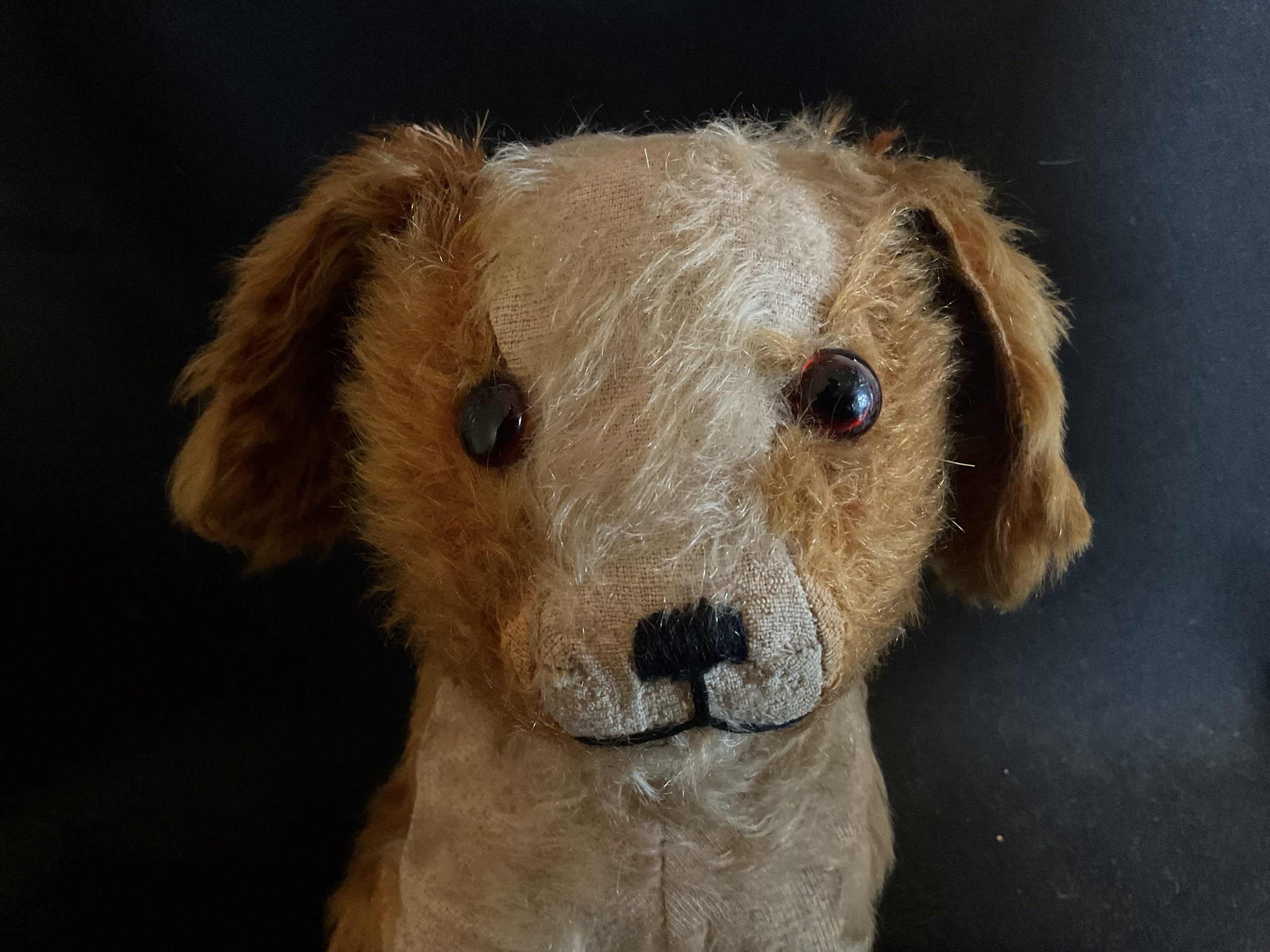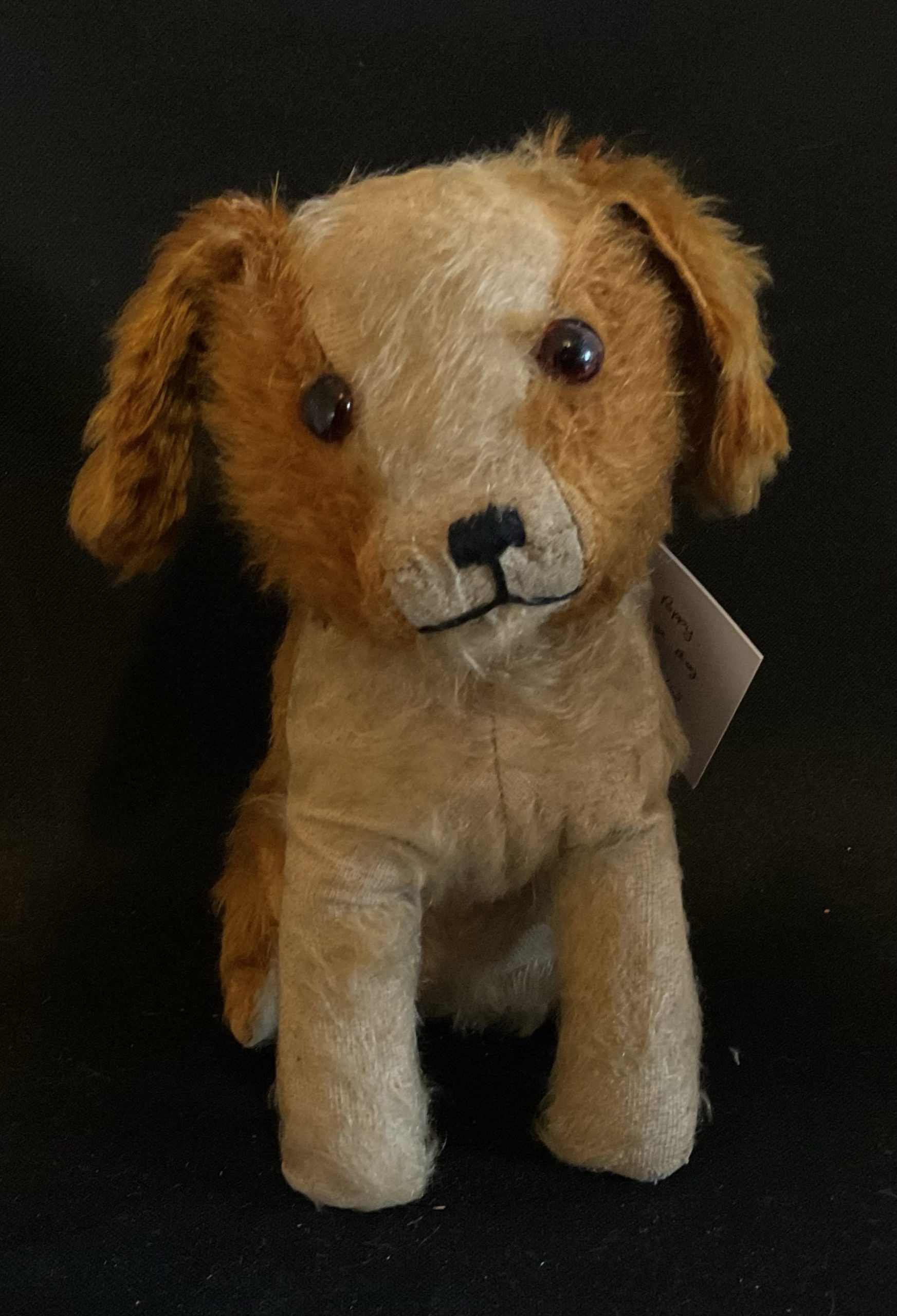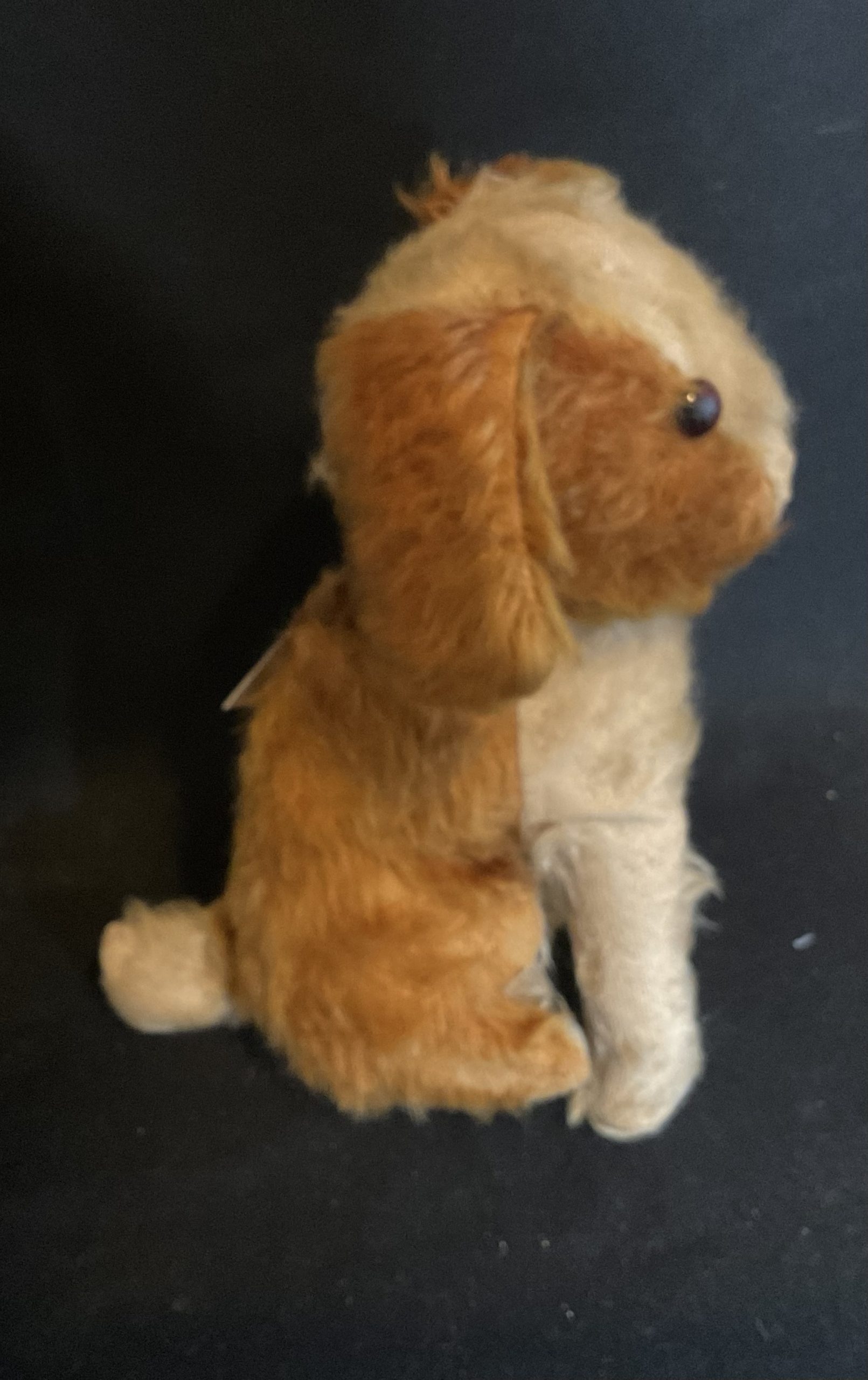 Poppy Delightful brown and cream mohair vintage dog. All original with glass eyes. In seated position wood wool filled. Aprox 26cm tall Cleaned and moth treated.