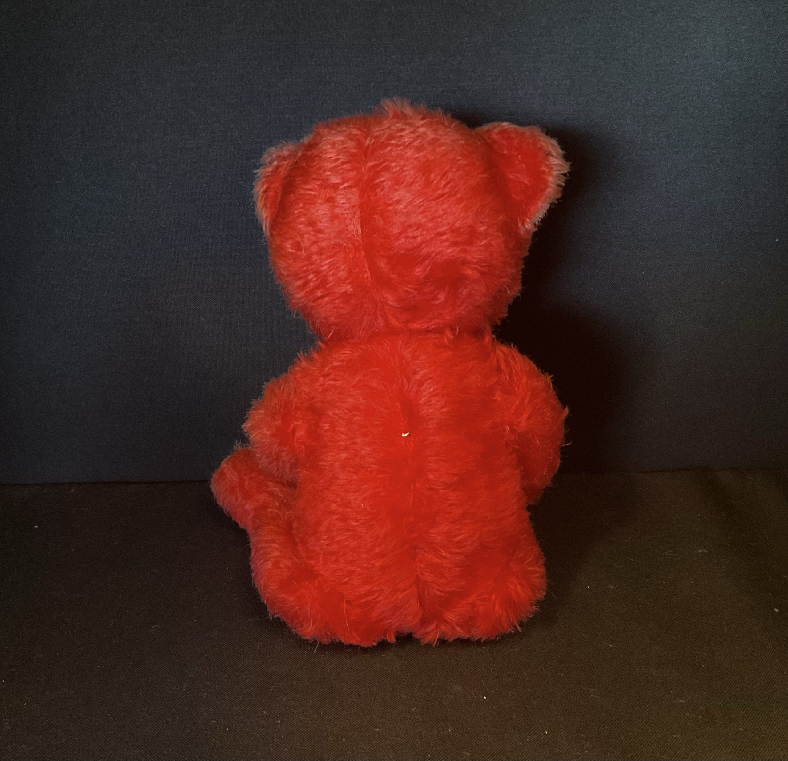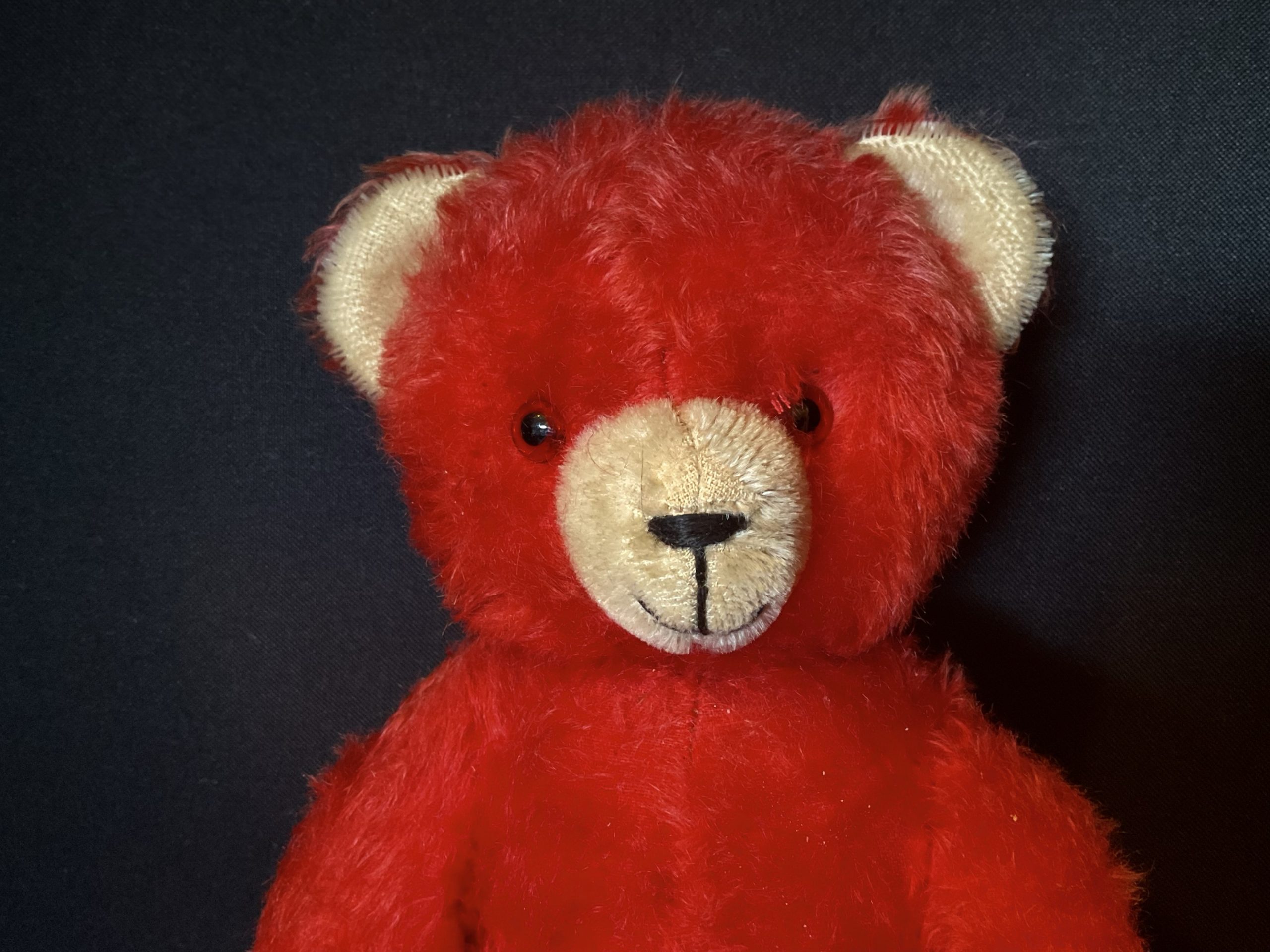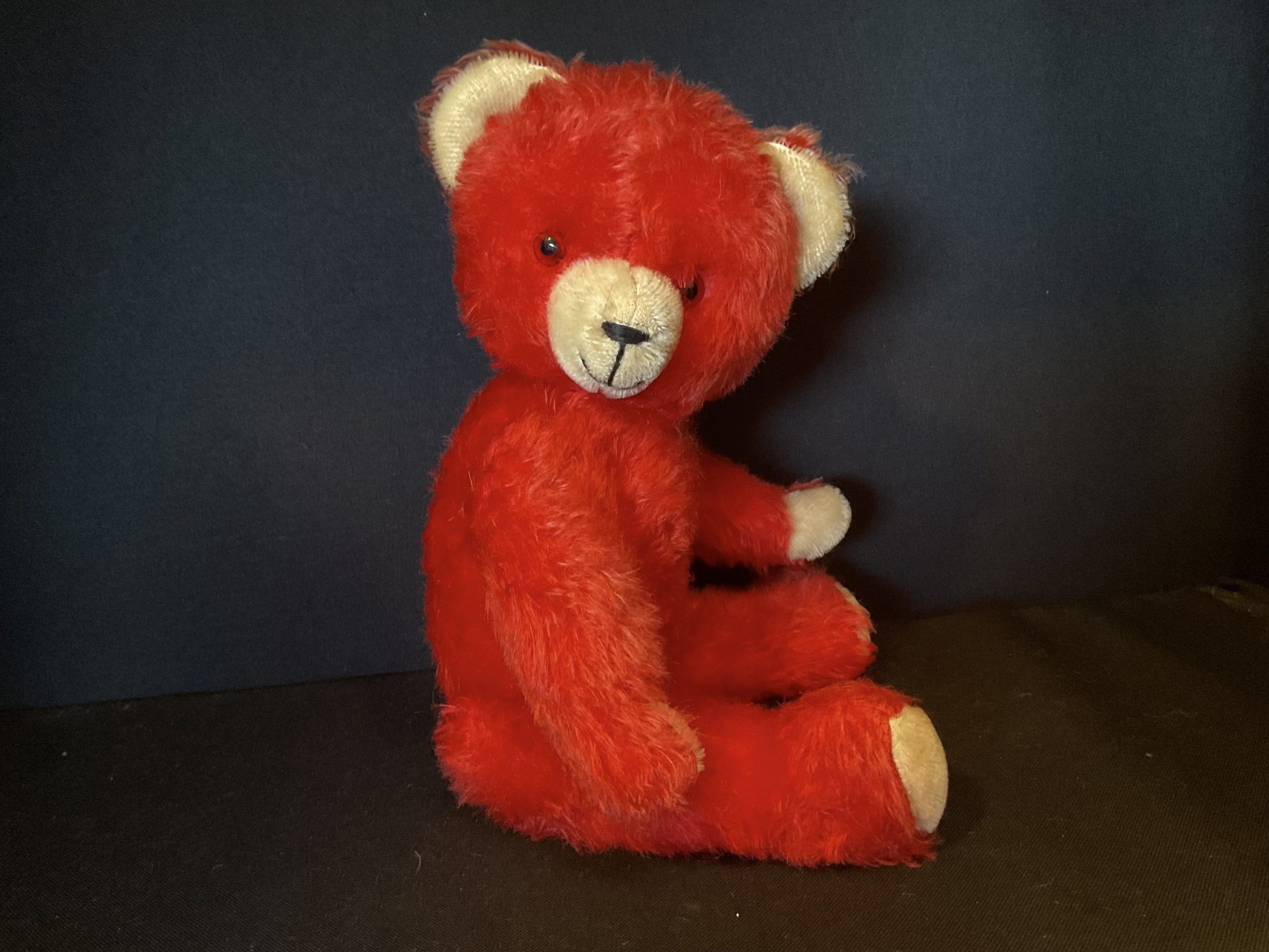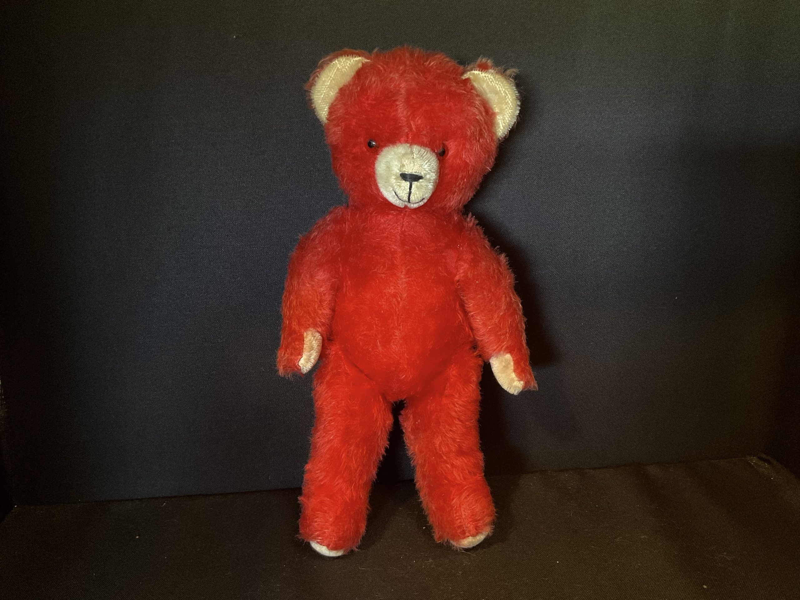 Reddy Teddy Vintage mohair fully joined bear with working growler, mohair paws and glass eyes. Unusual red colour, possibly a Sonnenberg bear from Germany. Cleaned, checked over and eyes refixed, otherwise all original. 43cm/18in aprox tall.