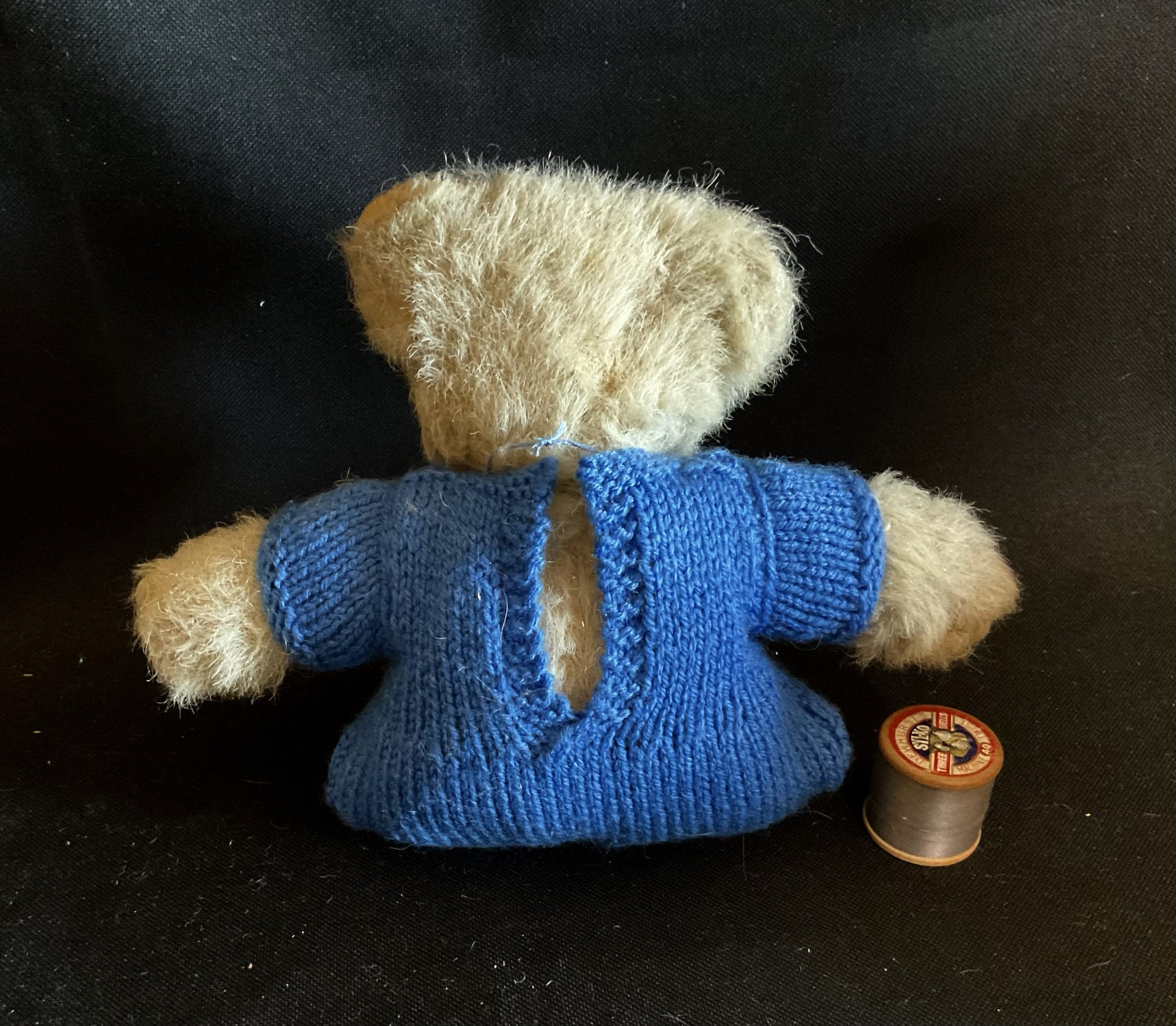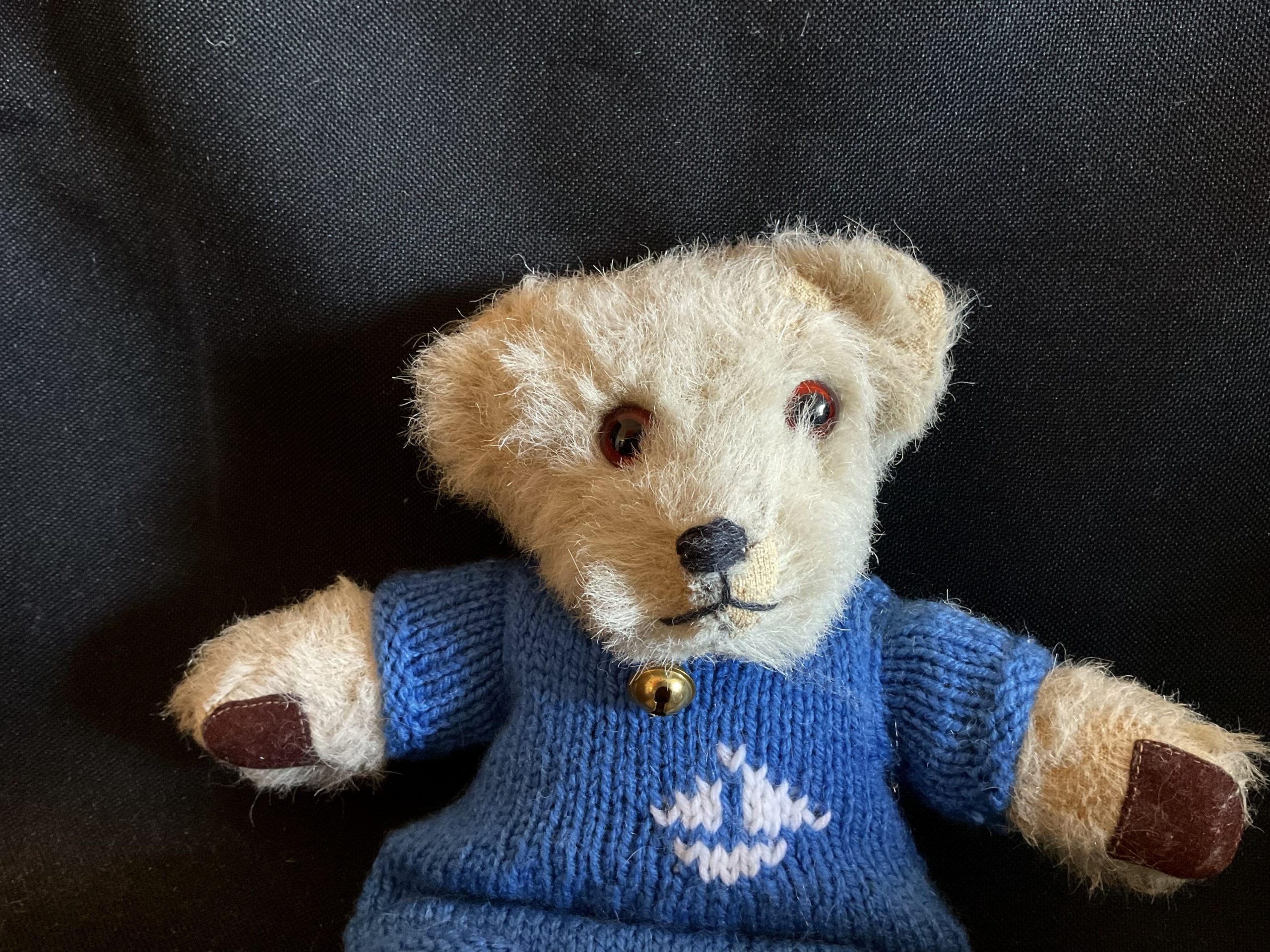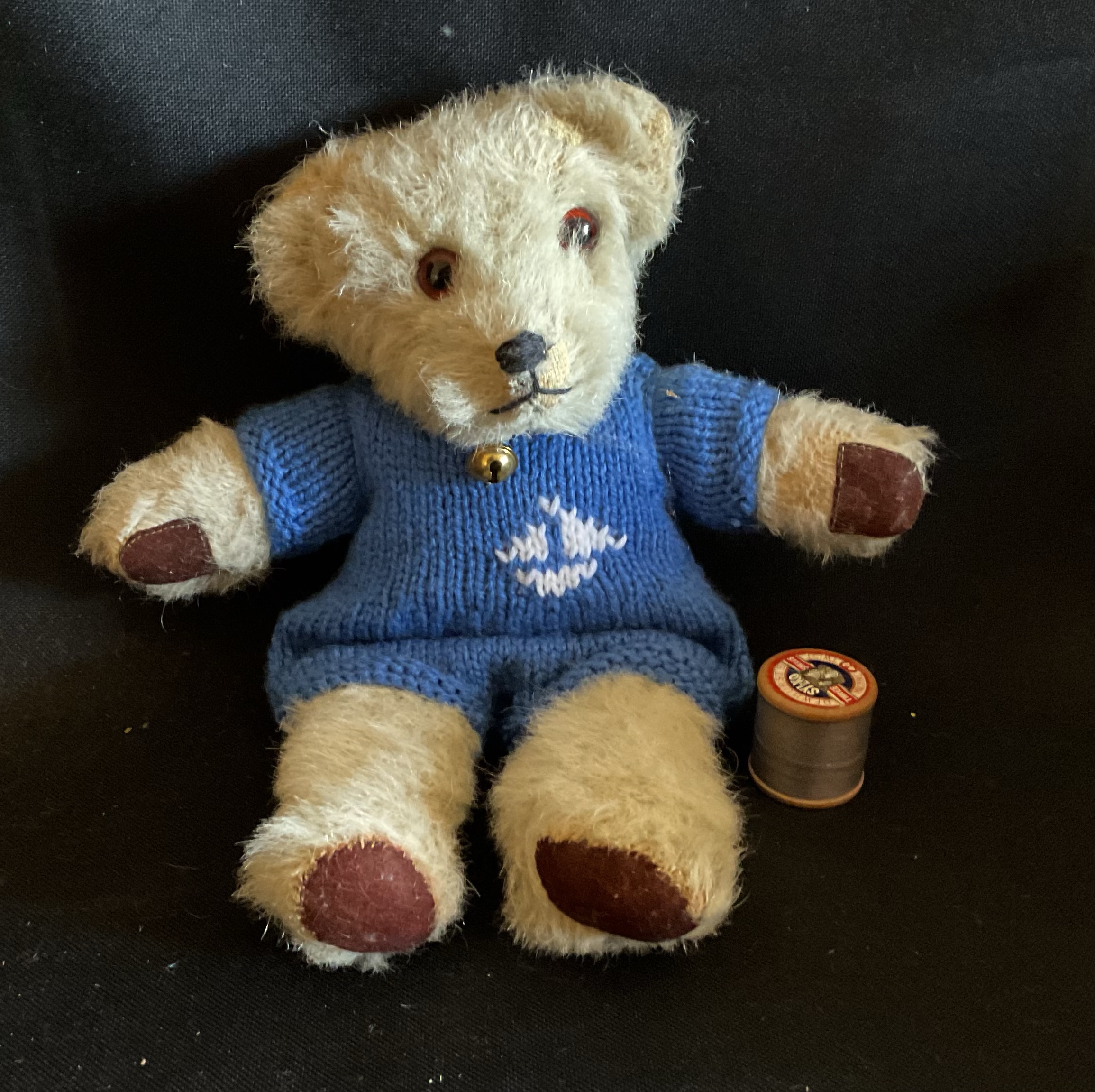 Sailorted Little vintage possibly home made wool/mohair teddy with felt paws and old glass eyes. Comes wearing his handknit blue sailor suit and gold coloured bell. Floppy limbed. Aprox 30cm tall