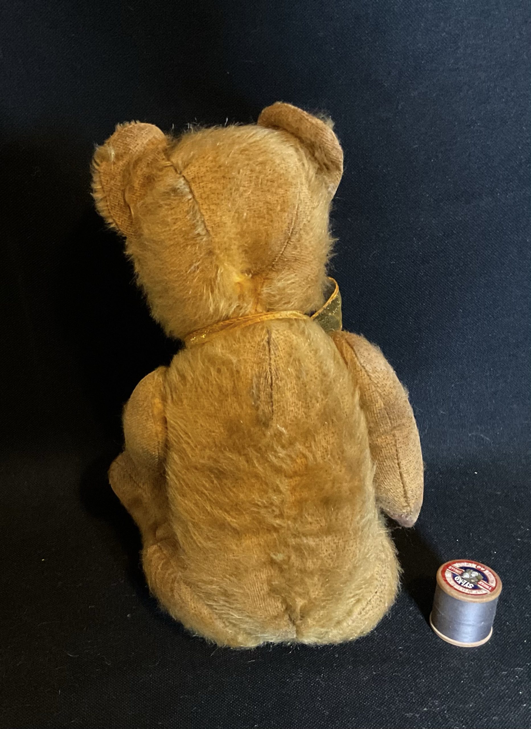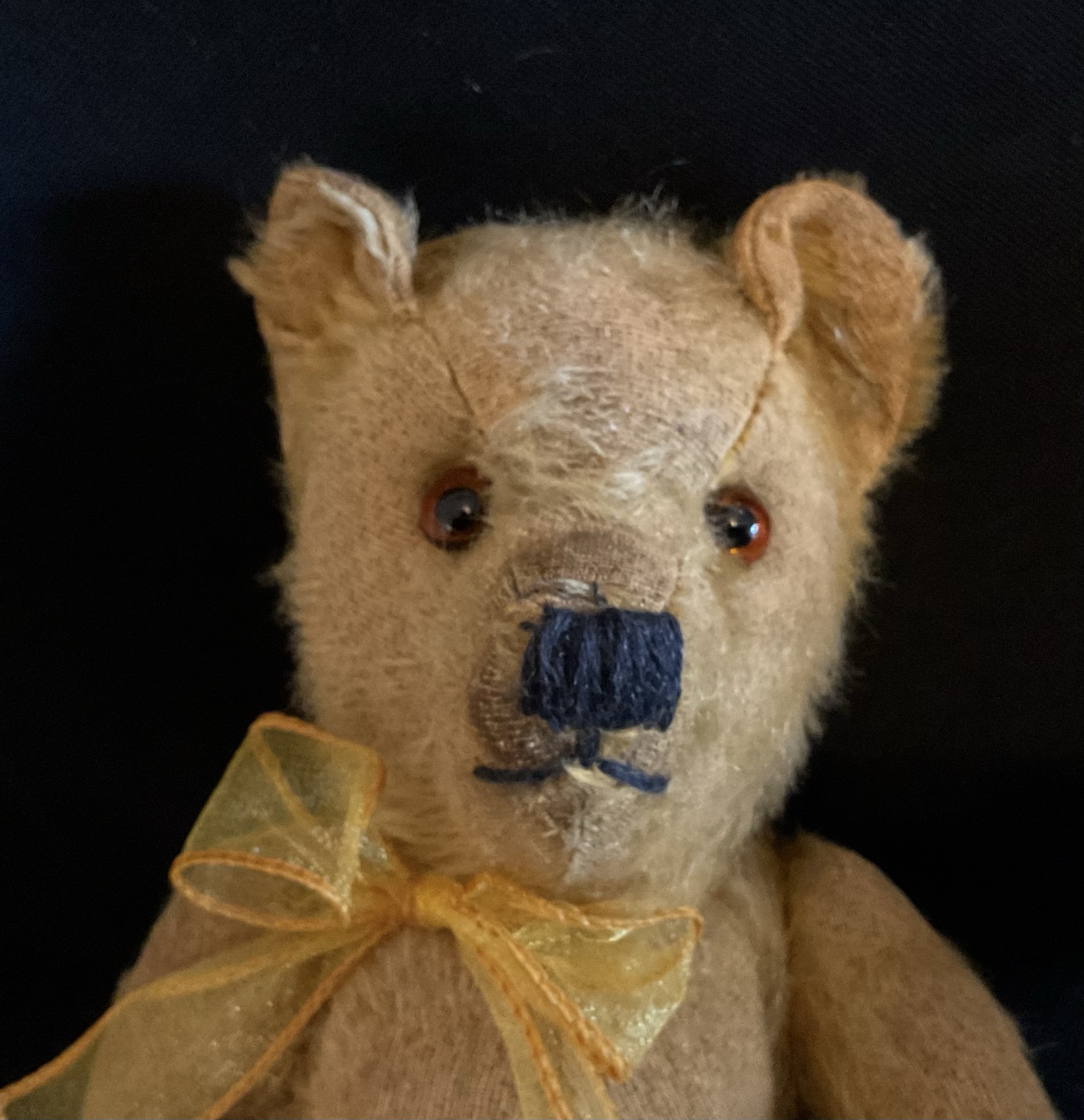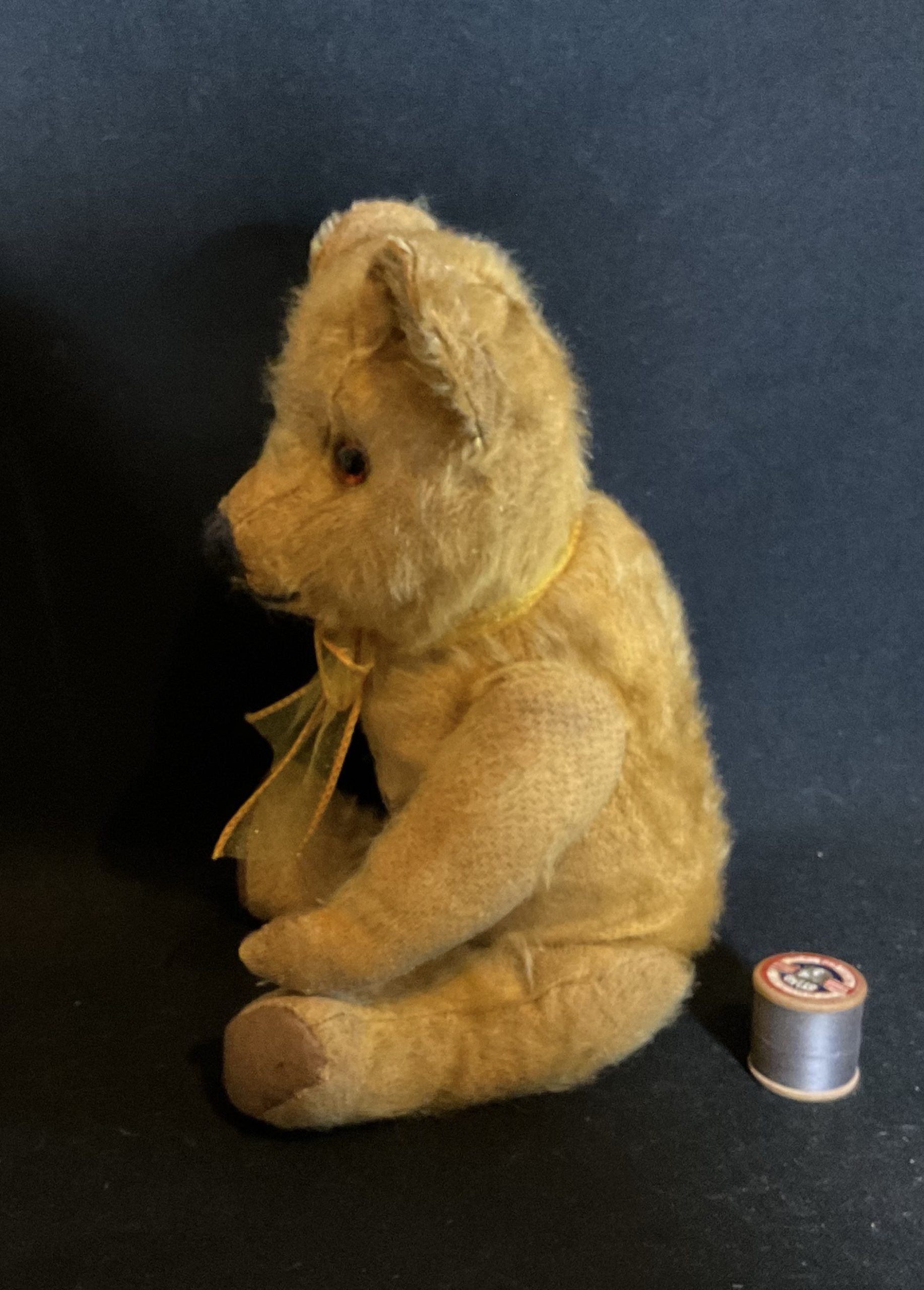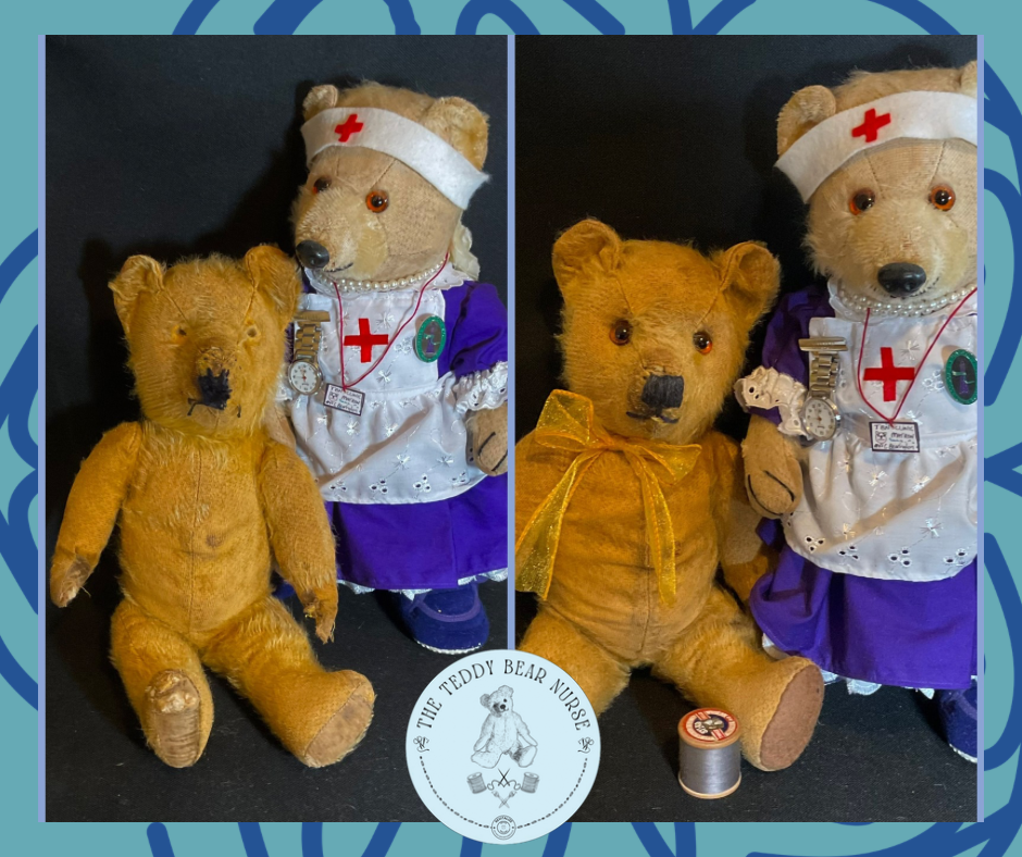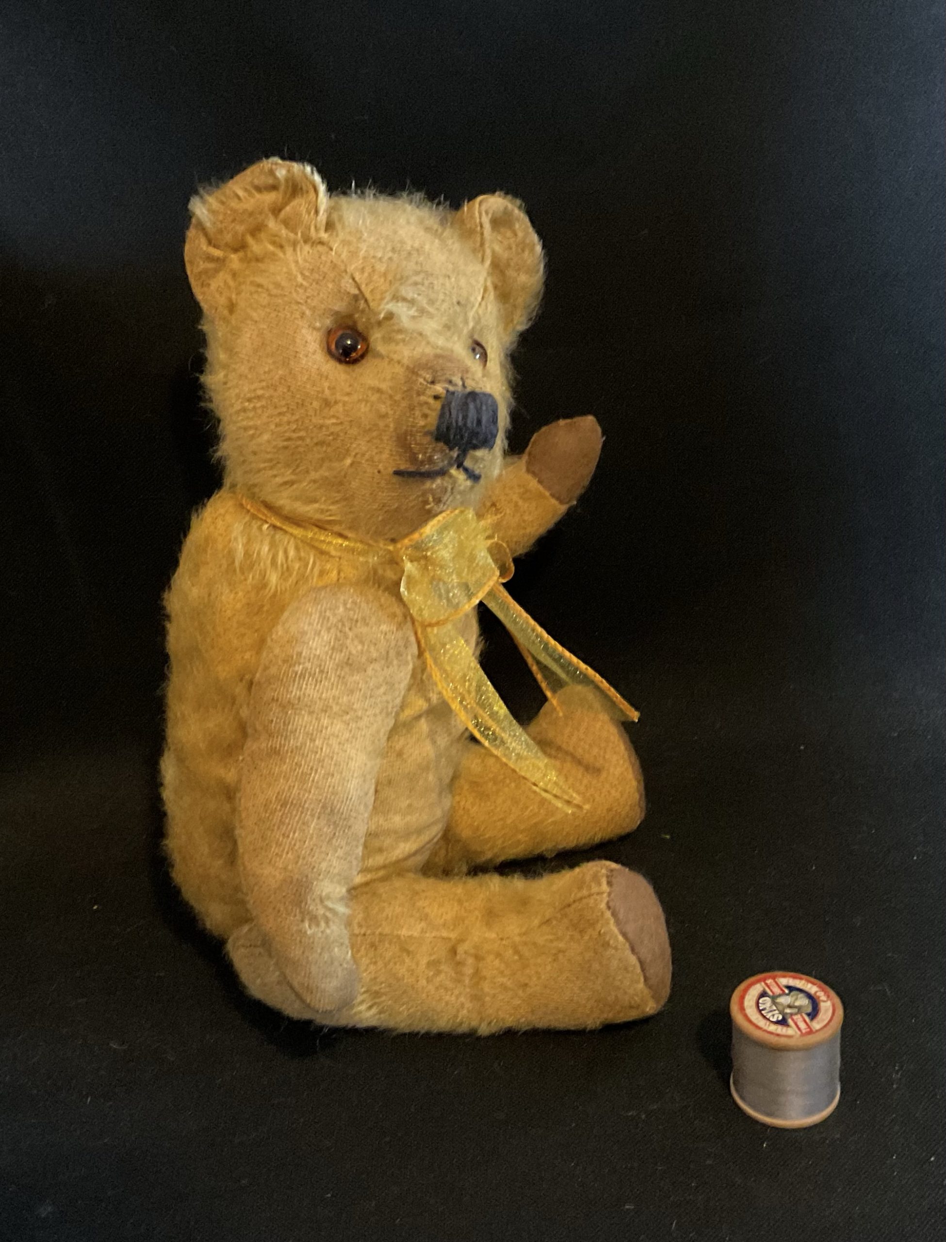 Sean Vintage 1940’s/50’s teddy made by Pedigree. Mohair, fully jointed with new glass eyes. Please see pictures as he came to the clinic as a rescue and has had new wool felt pads all round, eyes and neck joint. Cleaned and moth treated. Stands at aprox 38cm