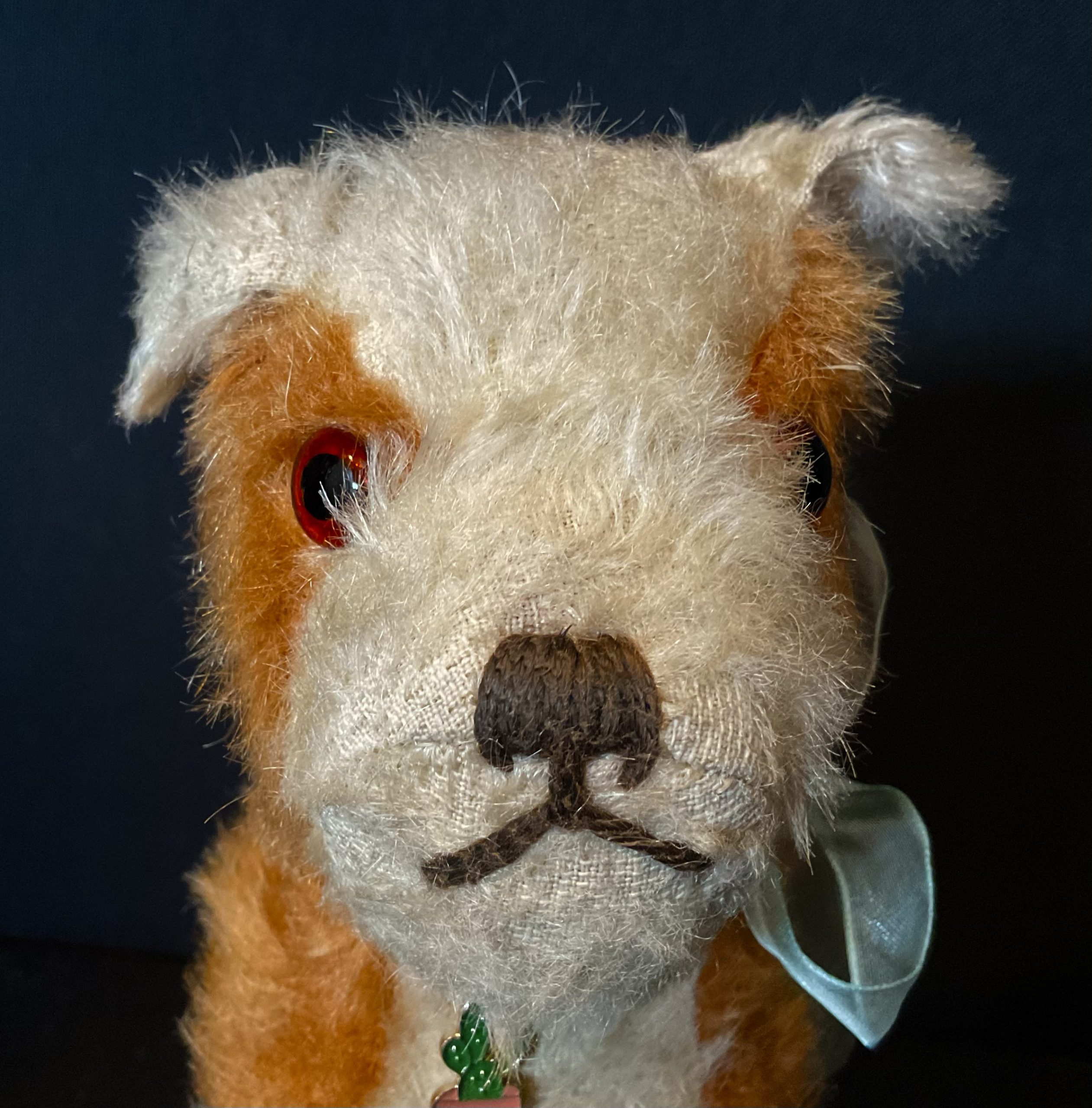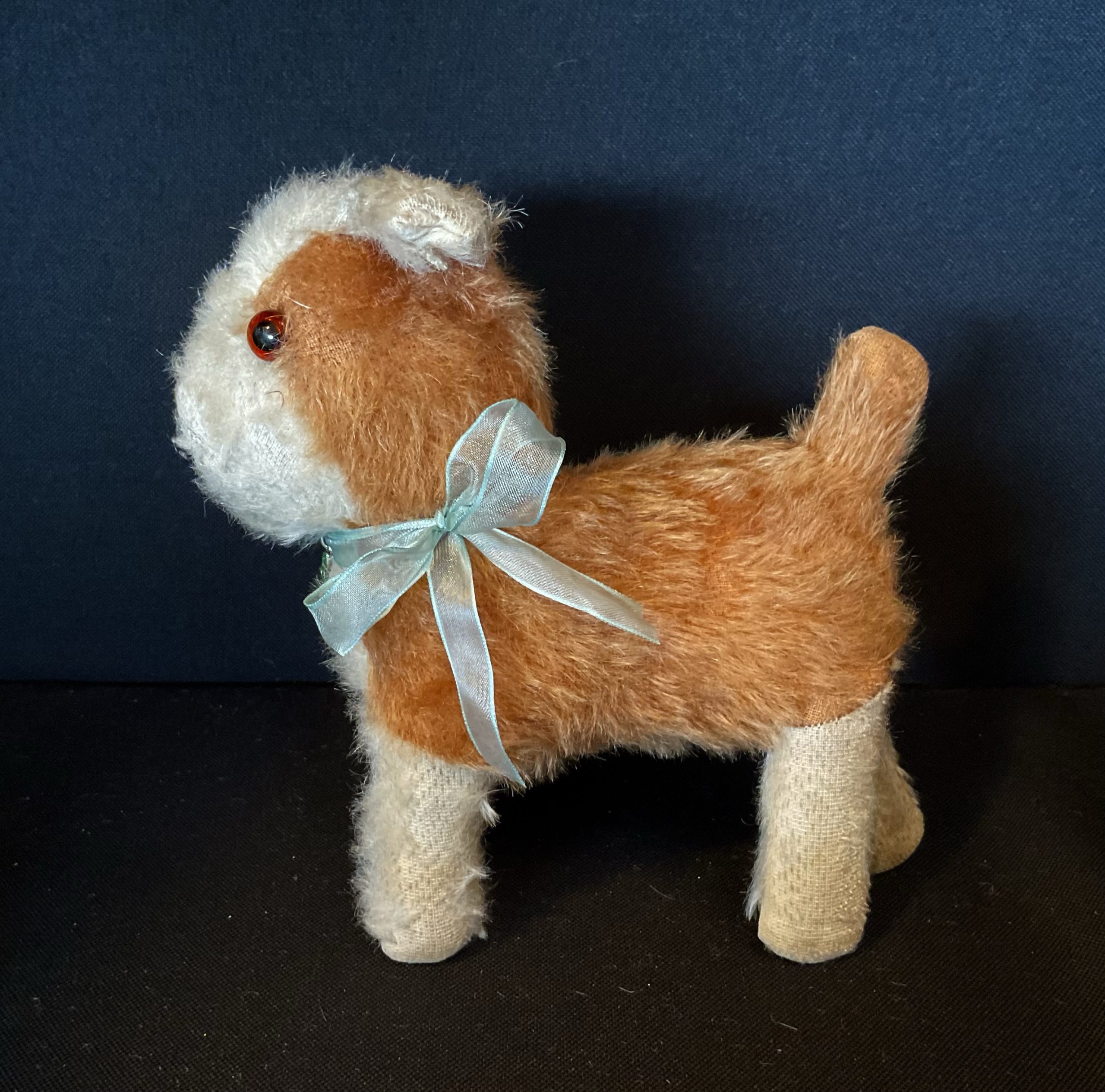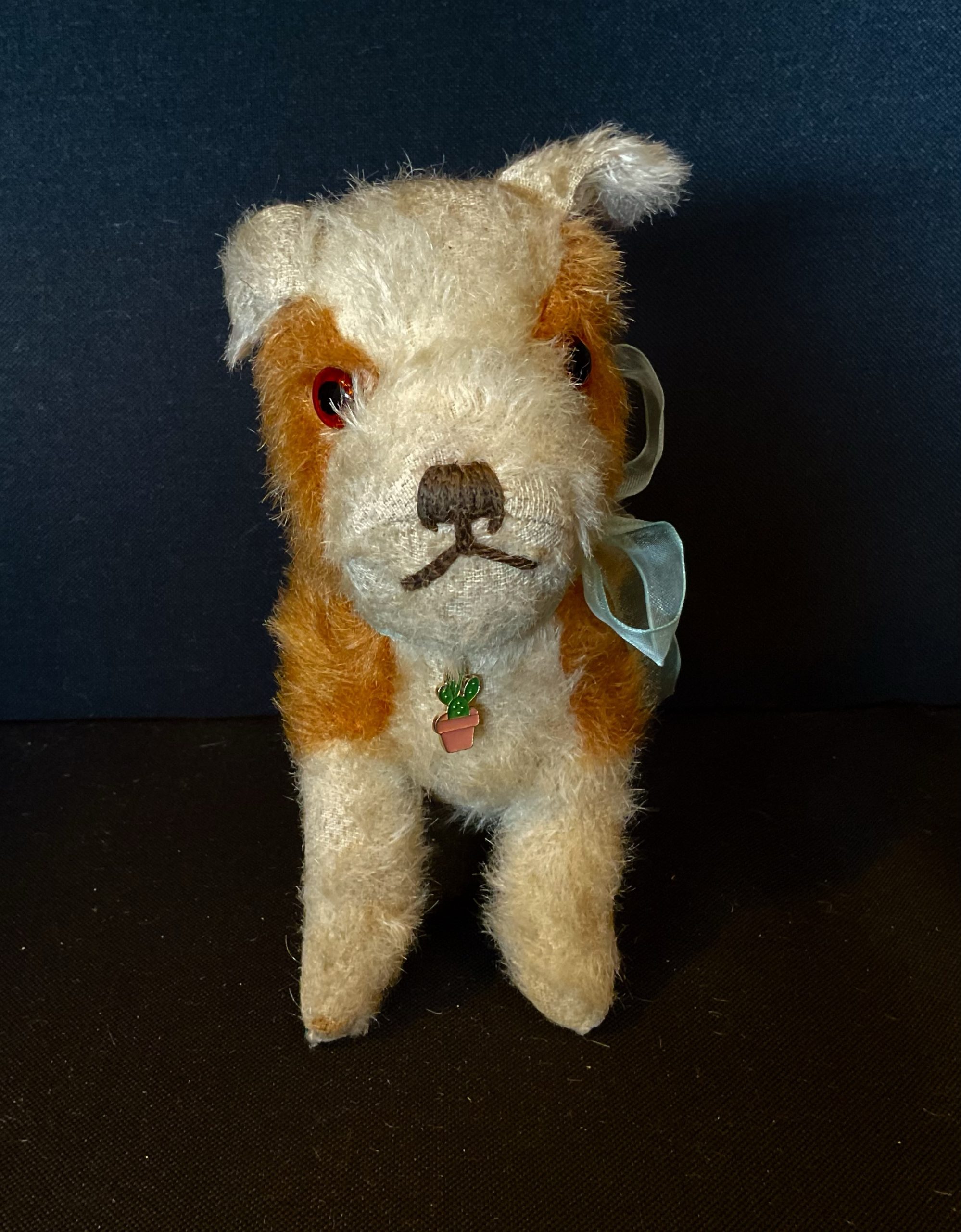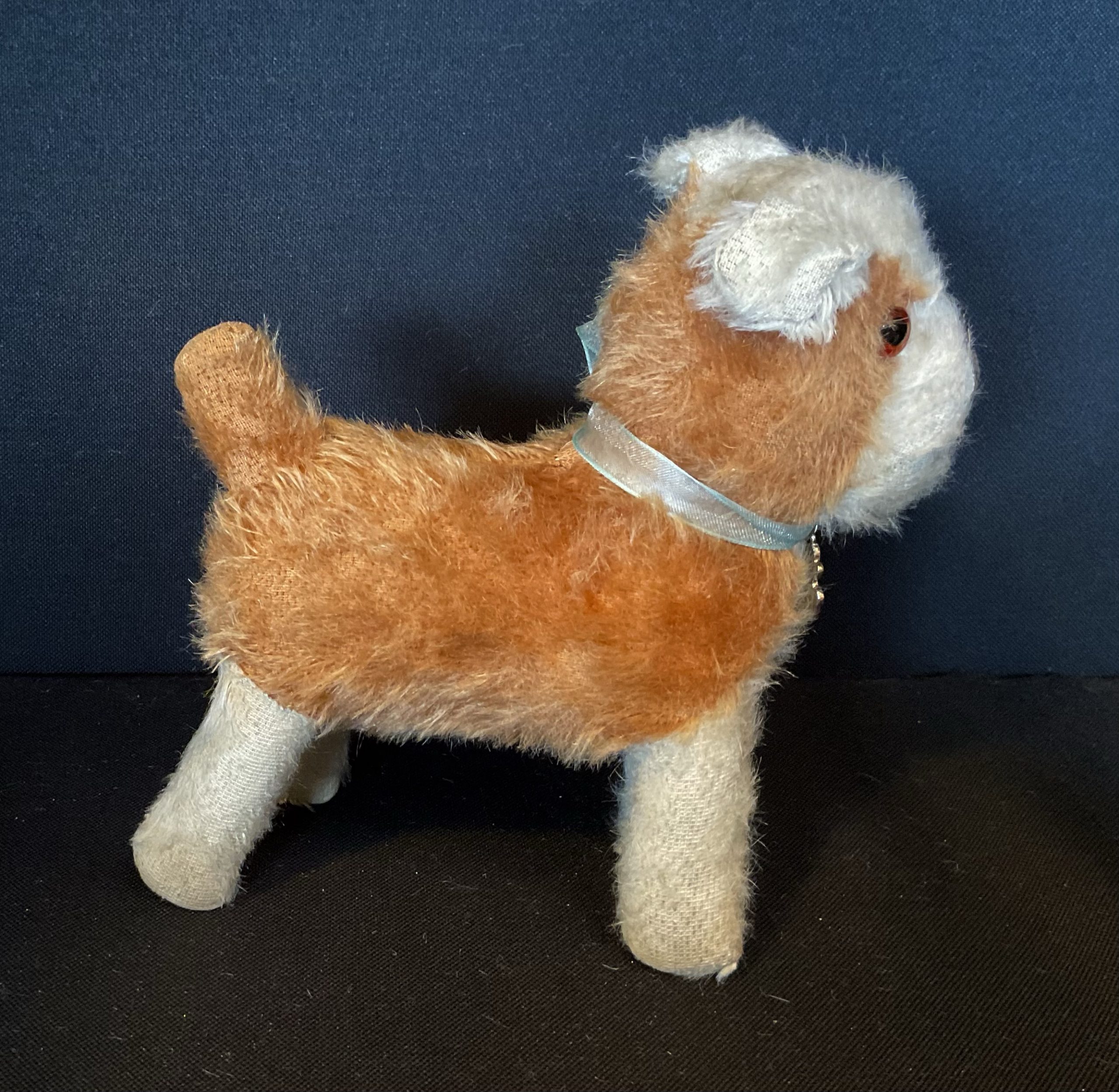 Spike Vintage mohair probably Chad Valley little dog. In brown and white. Wood wool filled. Glass eyes. Moth treated, cleaned checked over. Stands at approximately 19cm/8in
