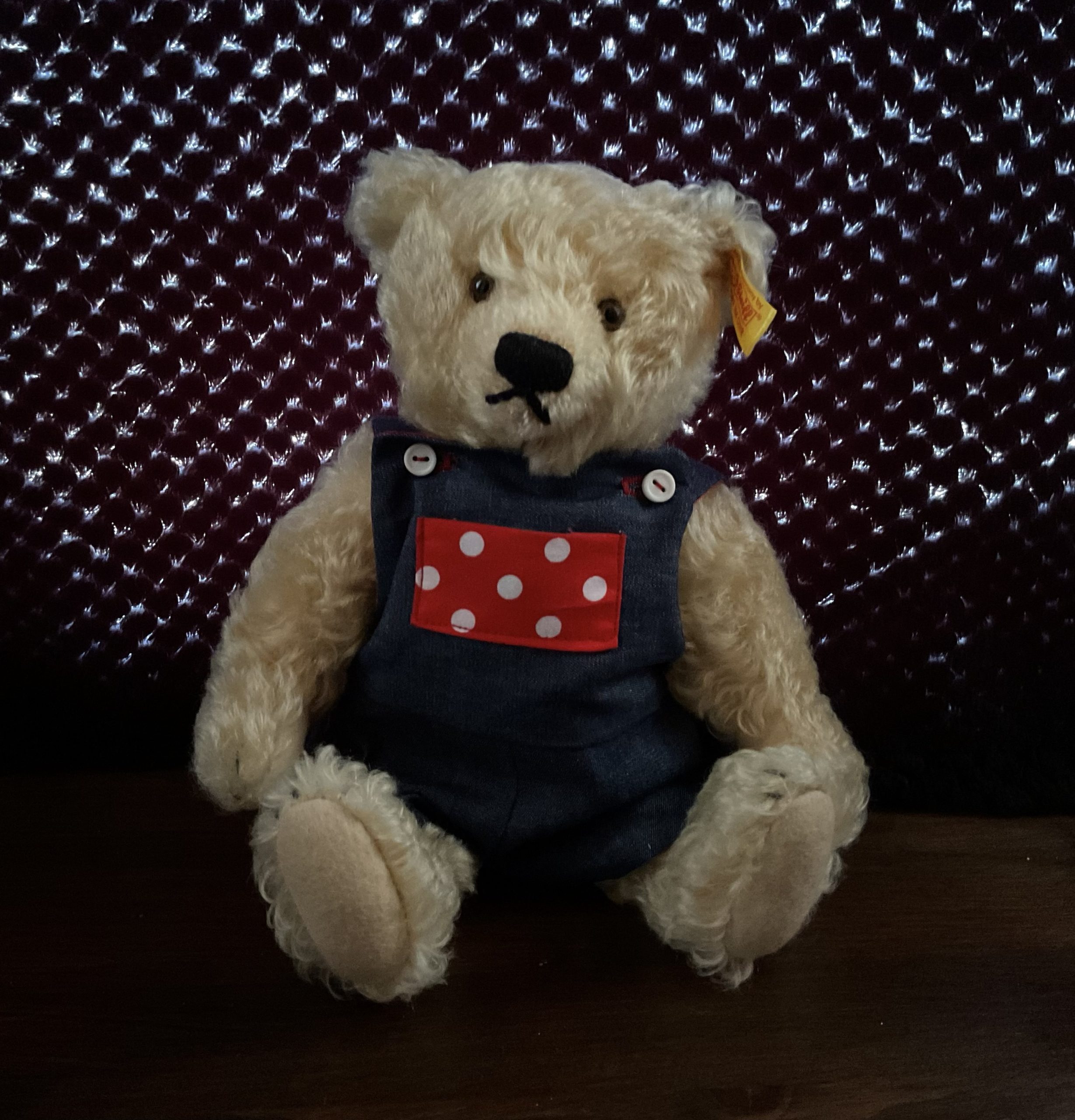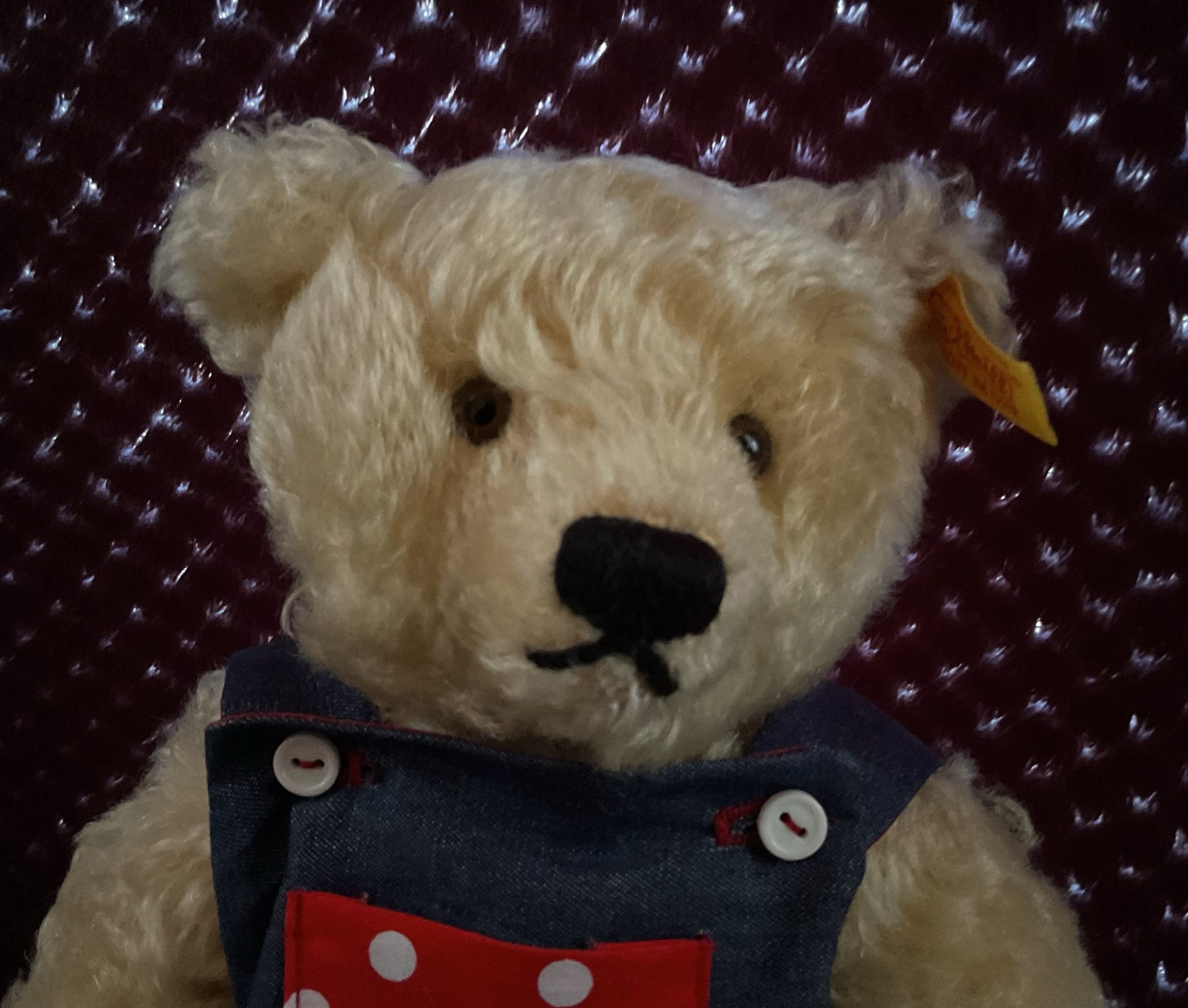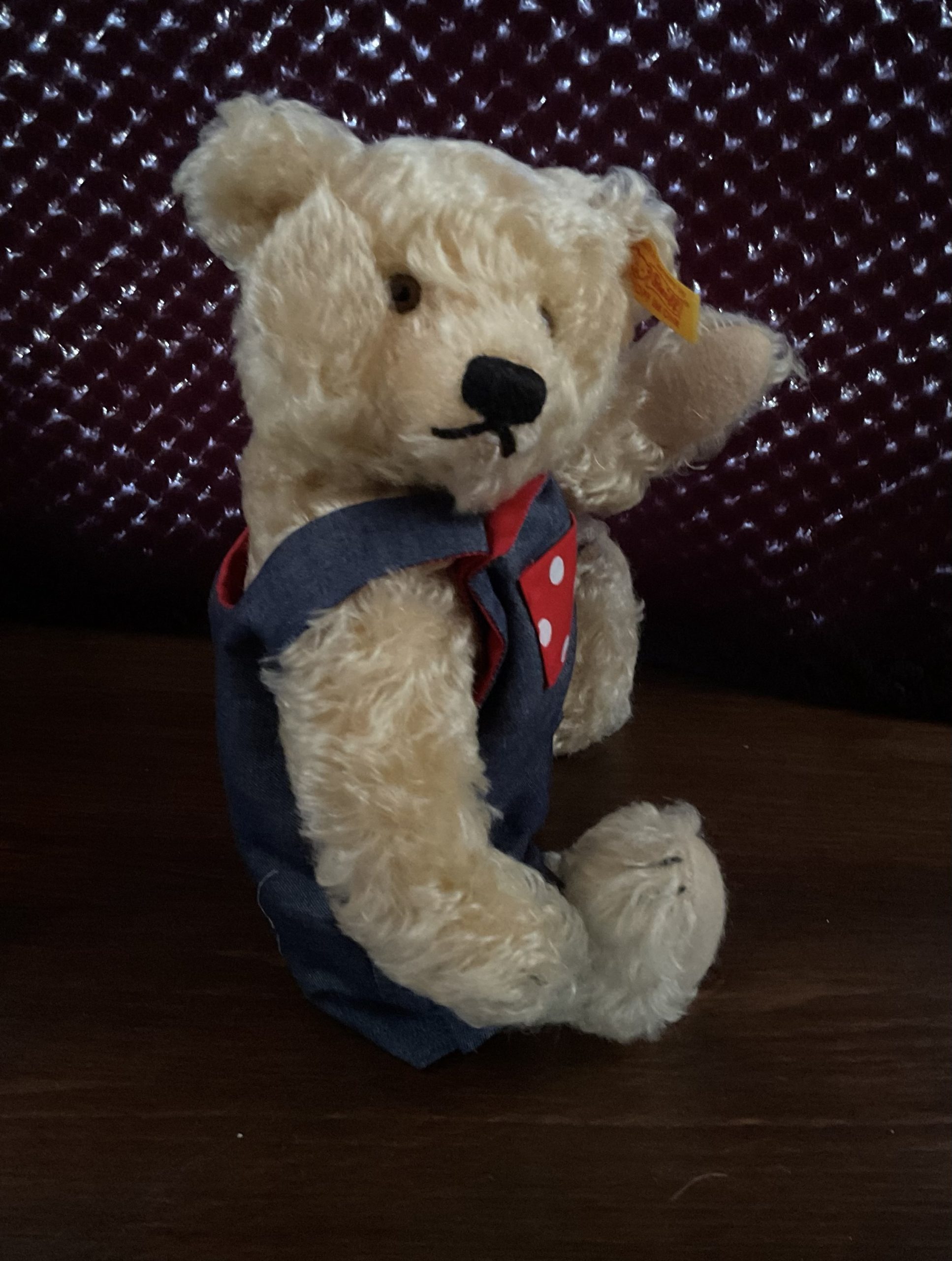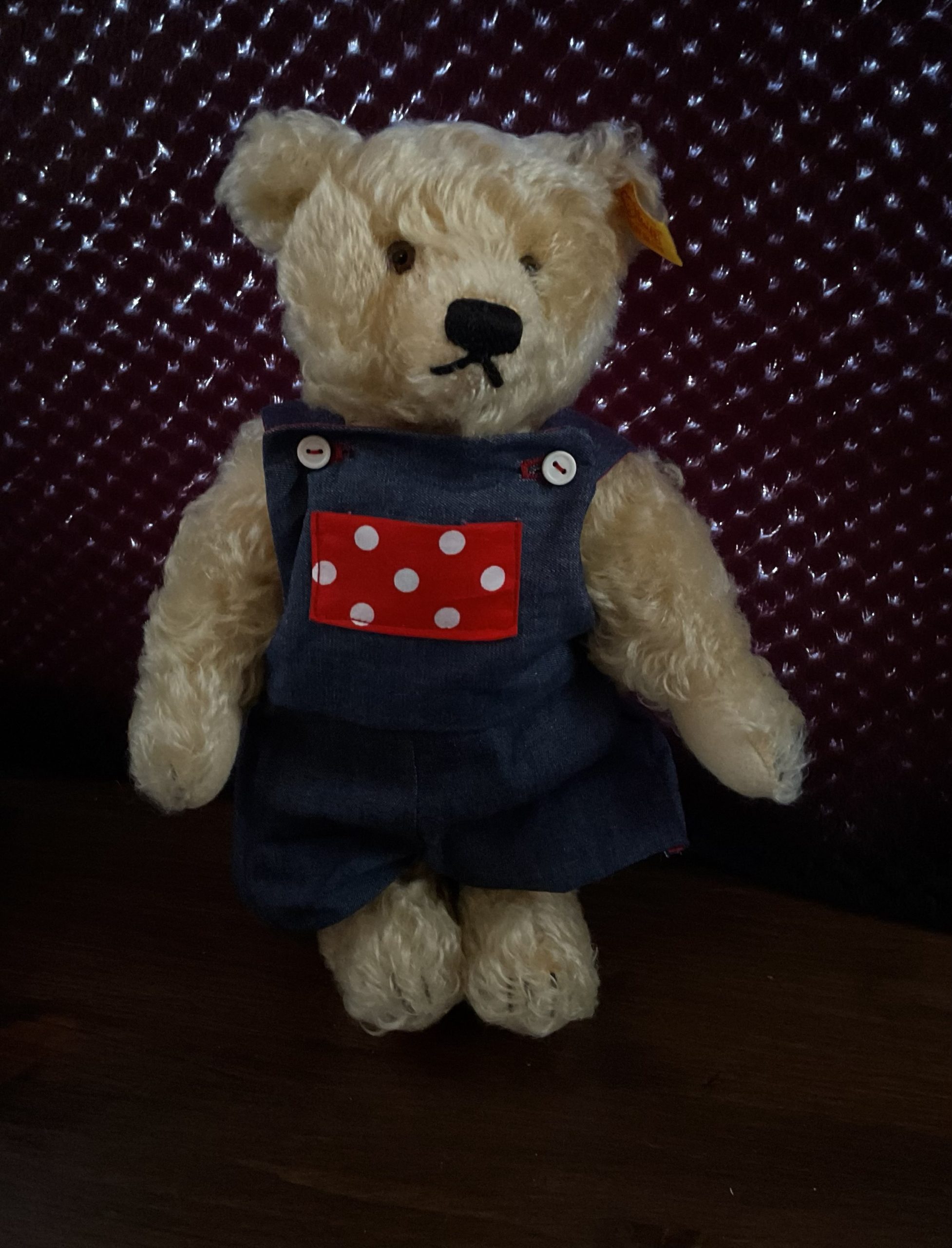 Steiff Original 1920 replica Blonde curly long mohair, excellent condition. All original, fully jointed. Wears handmade ‘one off’ dungarees. 25cm/10in.