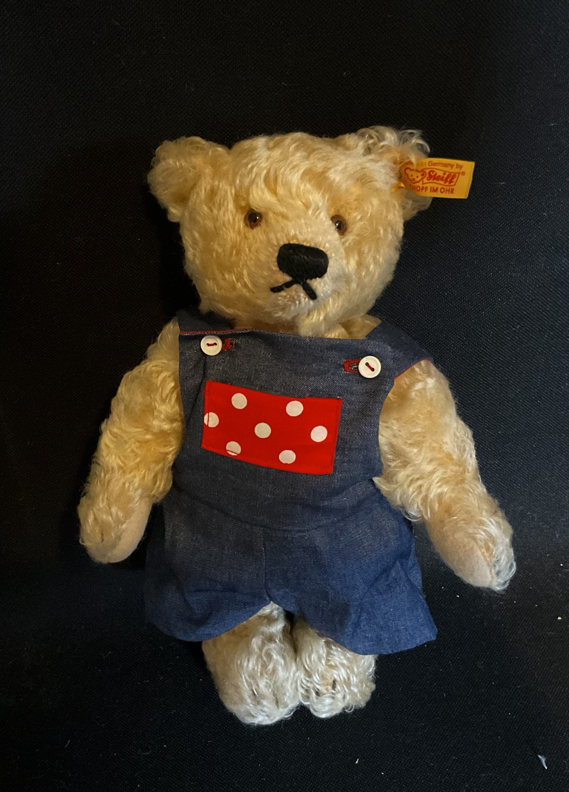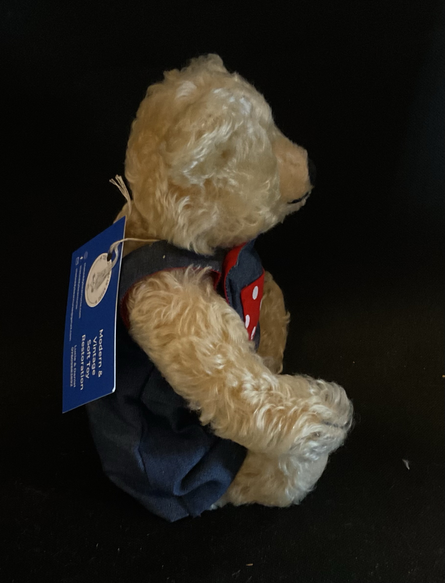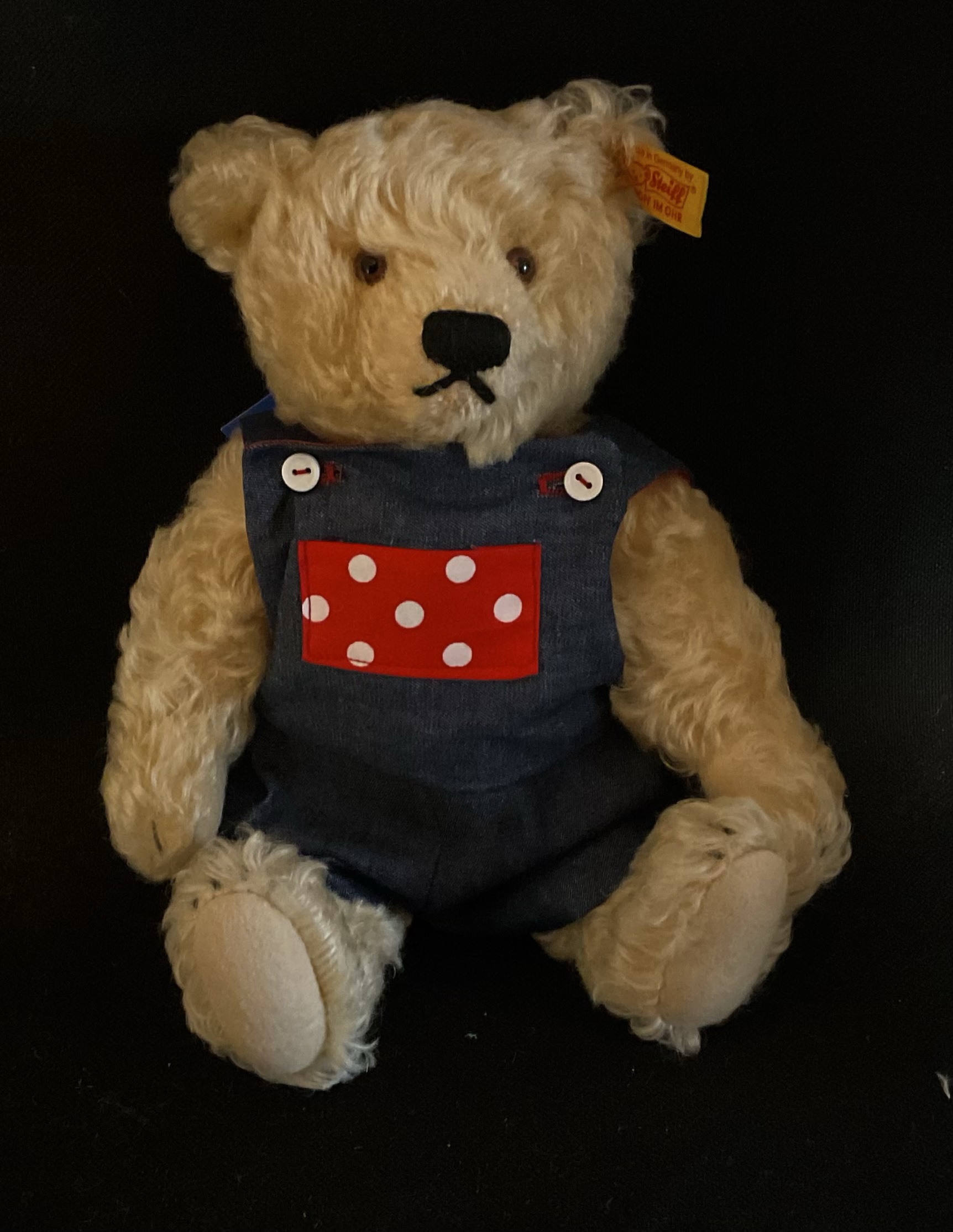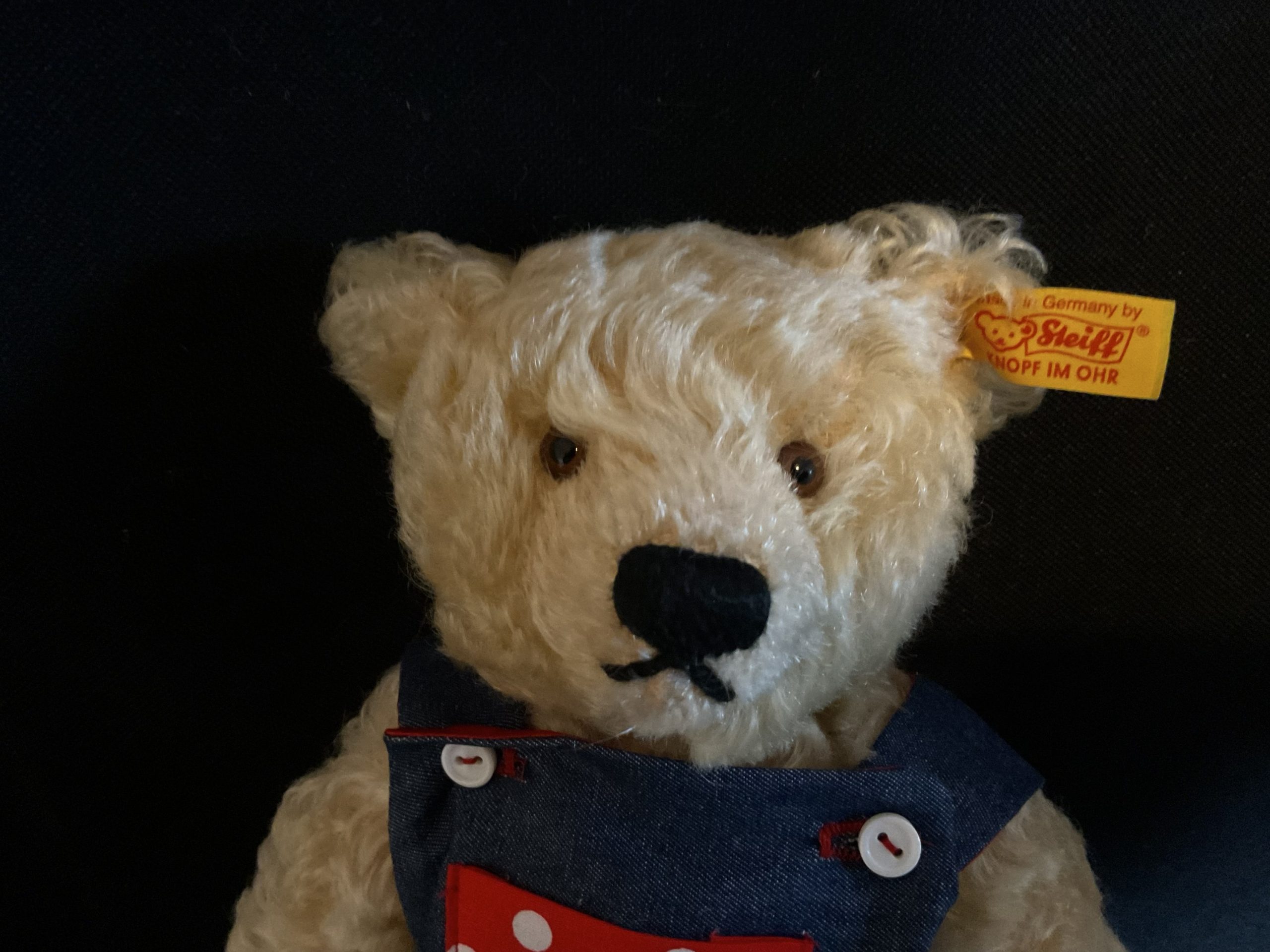 Stewart Beautiful as new Steiff with button and flag in his ear, All original in long blonde wavy mohair with trimmed muzzle. Wears denim style dungarees. 25cm tall