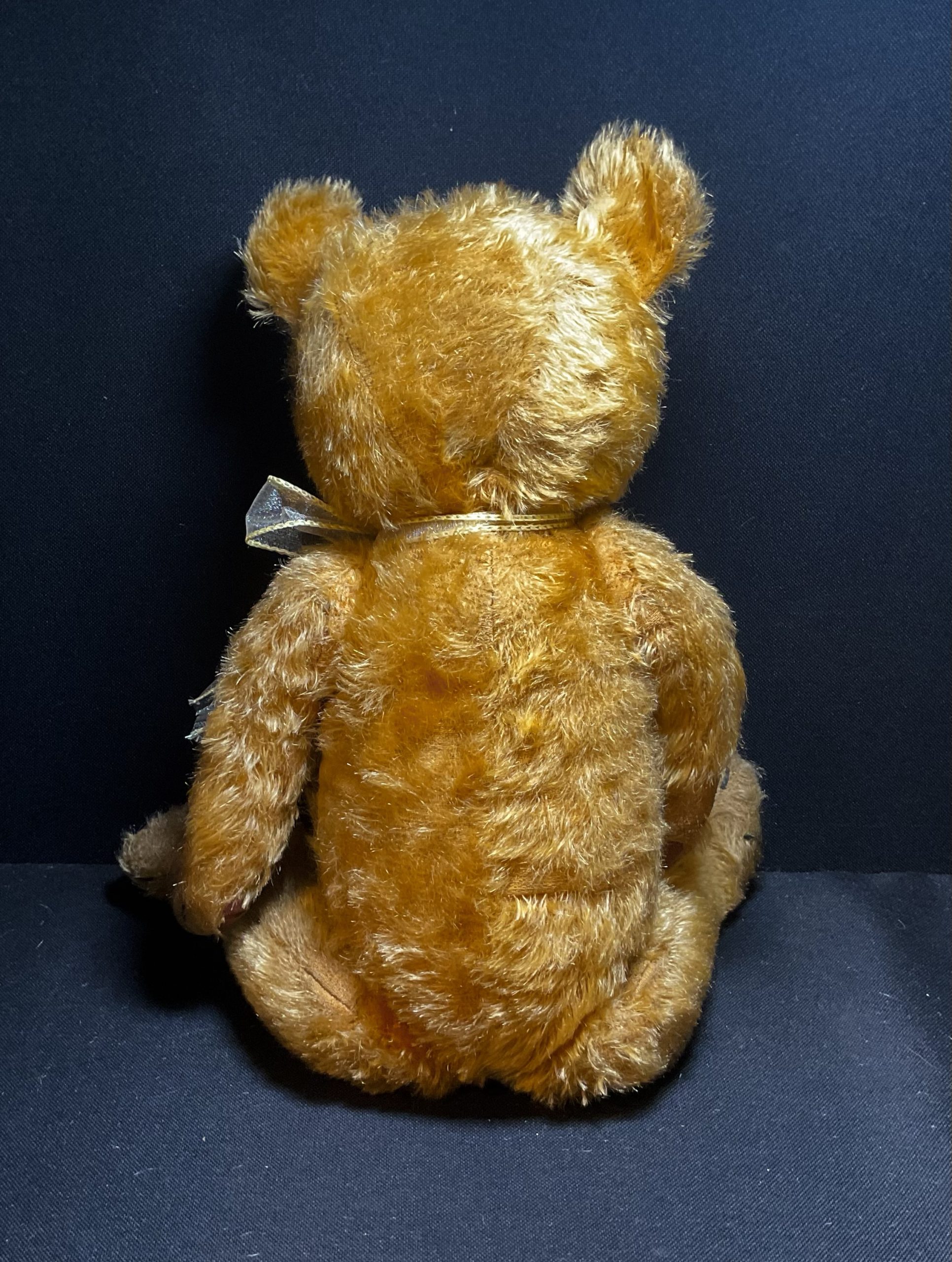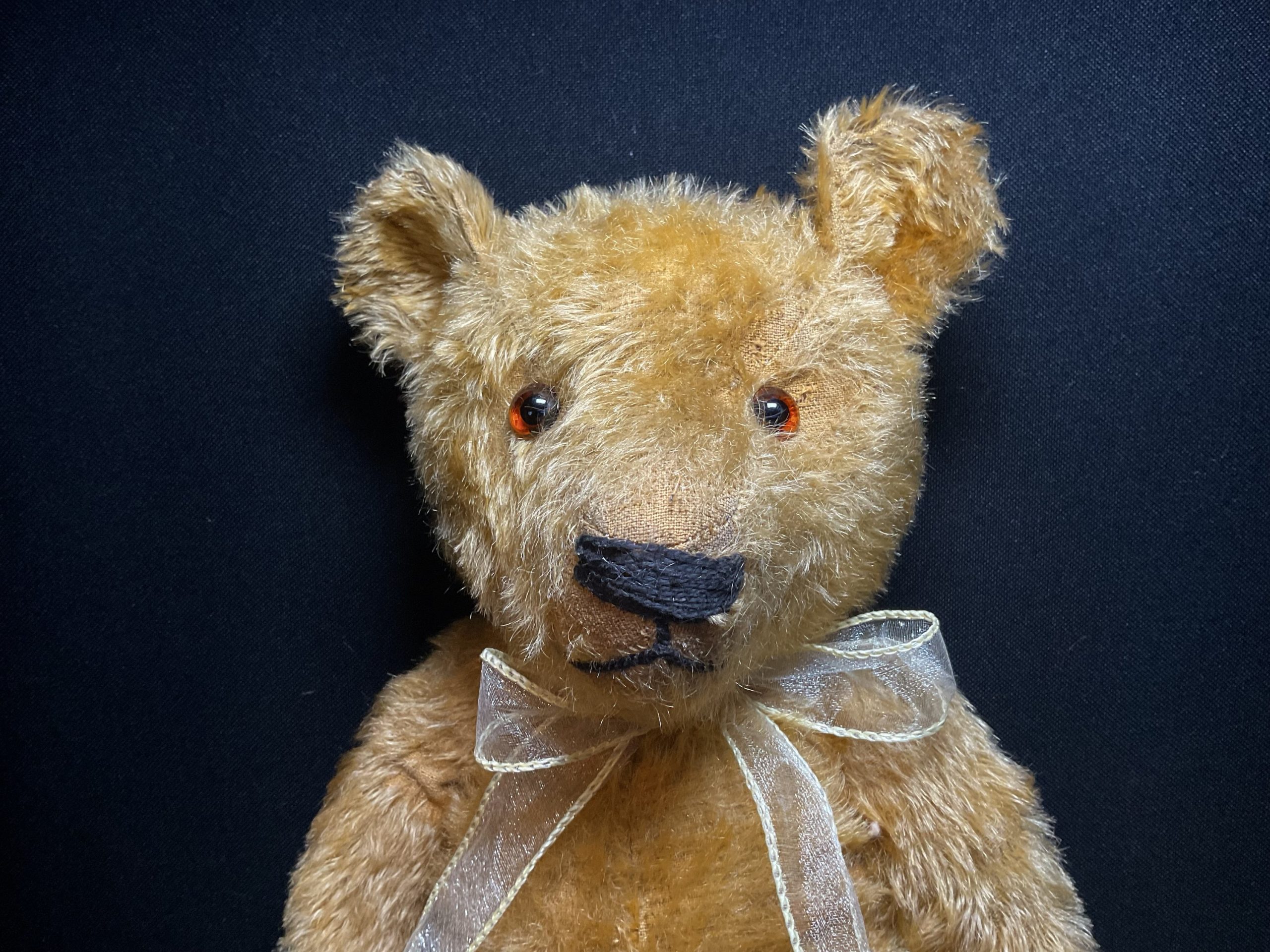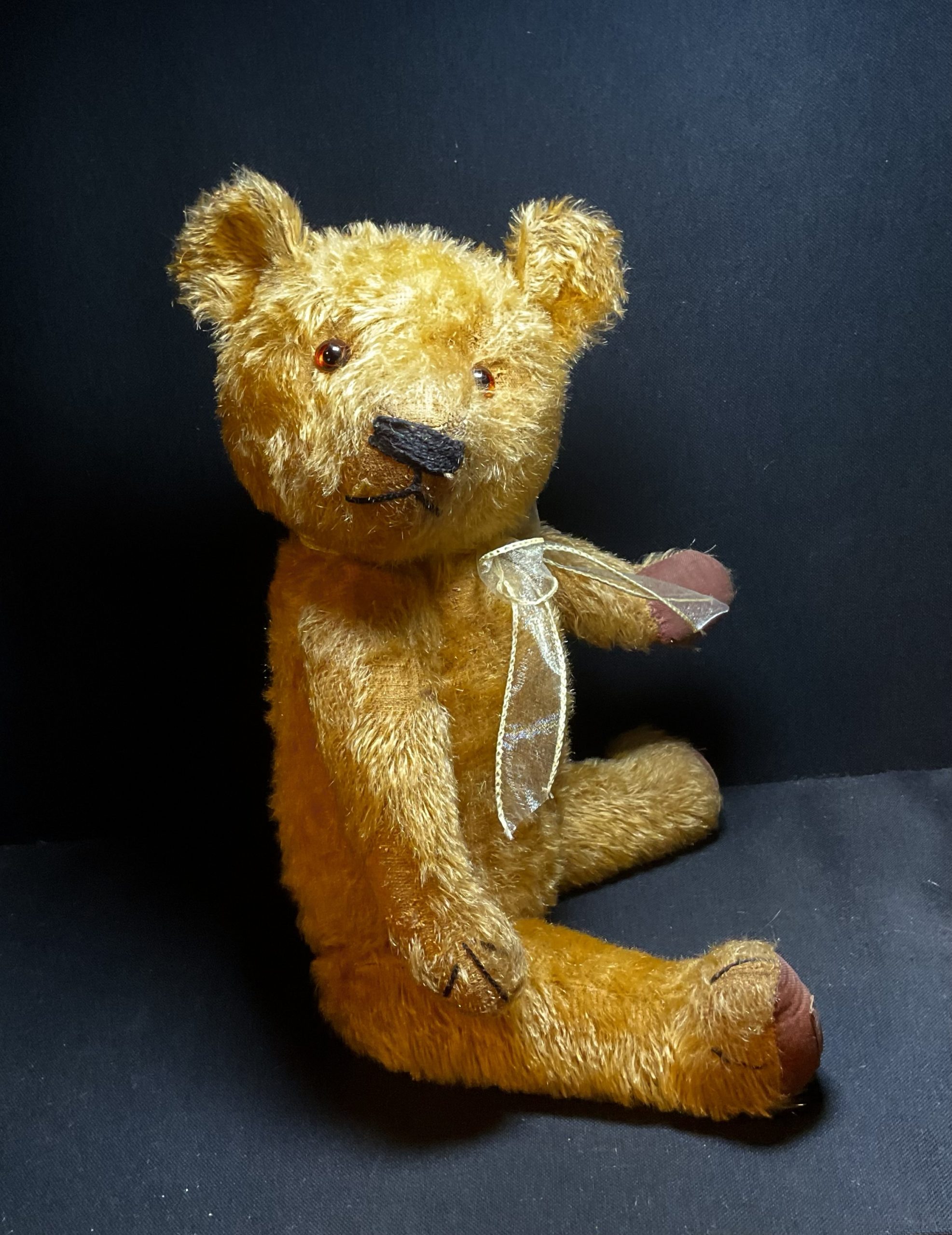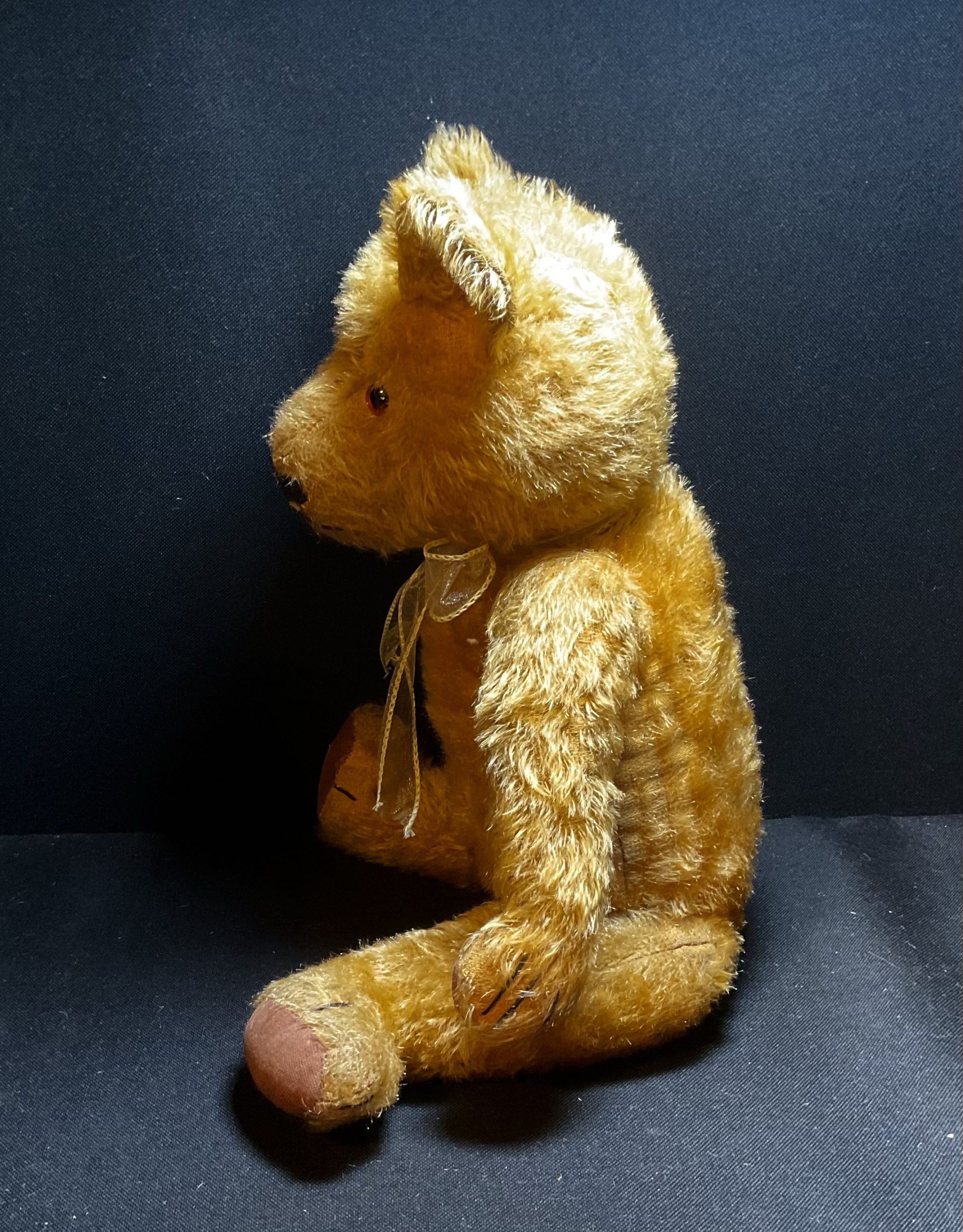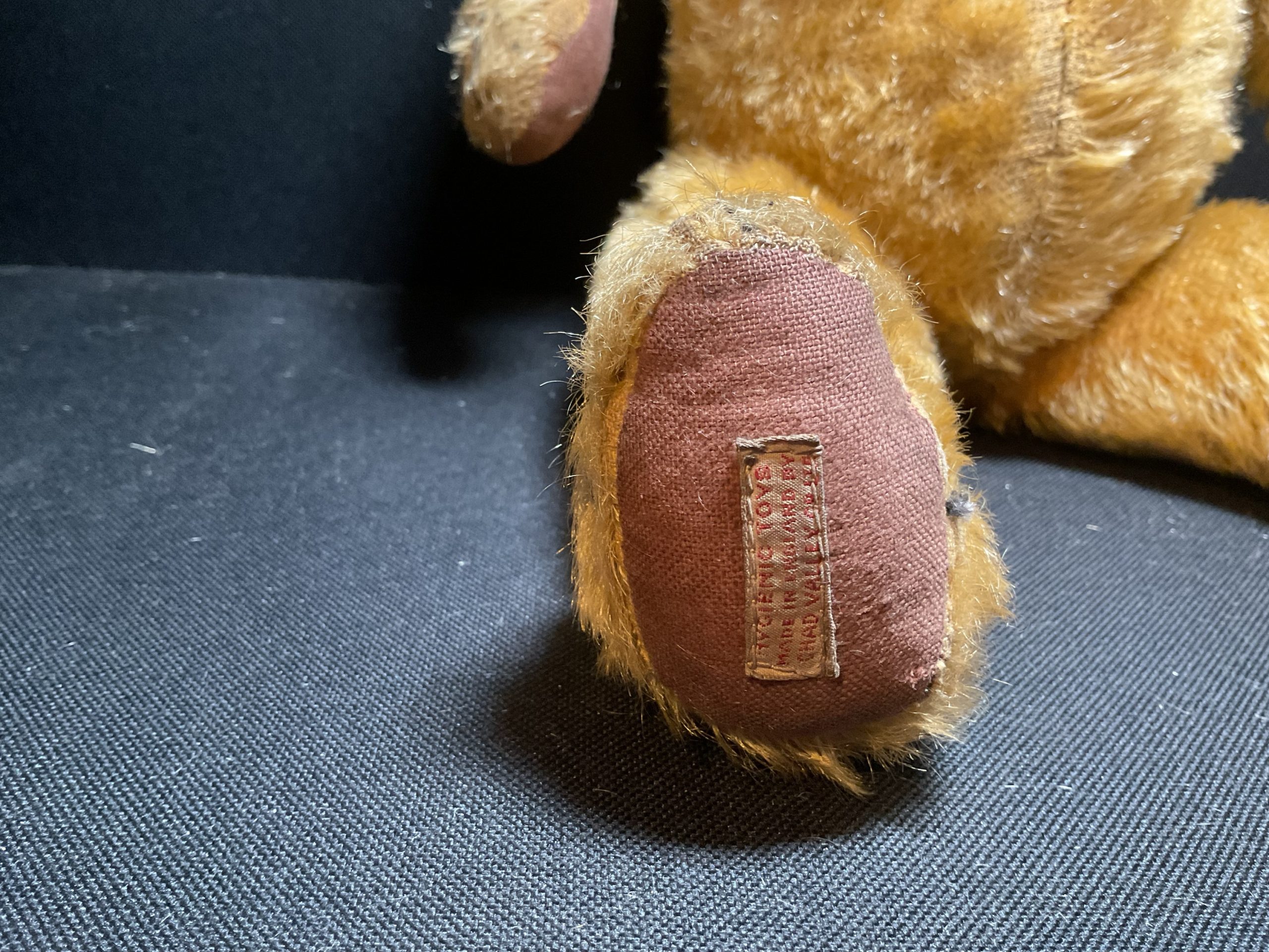 William Chad Valley Magna mohair bear from the 1940s. Fully jointed, glass eyes, original pads and label. Fair mohair coverage still. Original nose stitching which is rather wonky! Has had aprox 1cm of skin grafting to worn cheek. See pictures. Cleaned, moth treated. 20in tall approximately